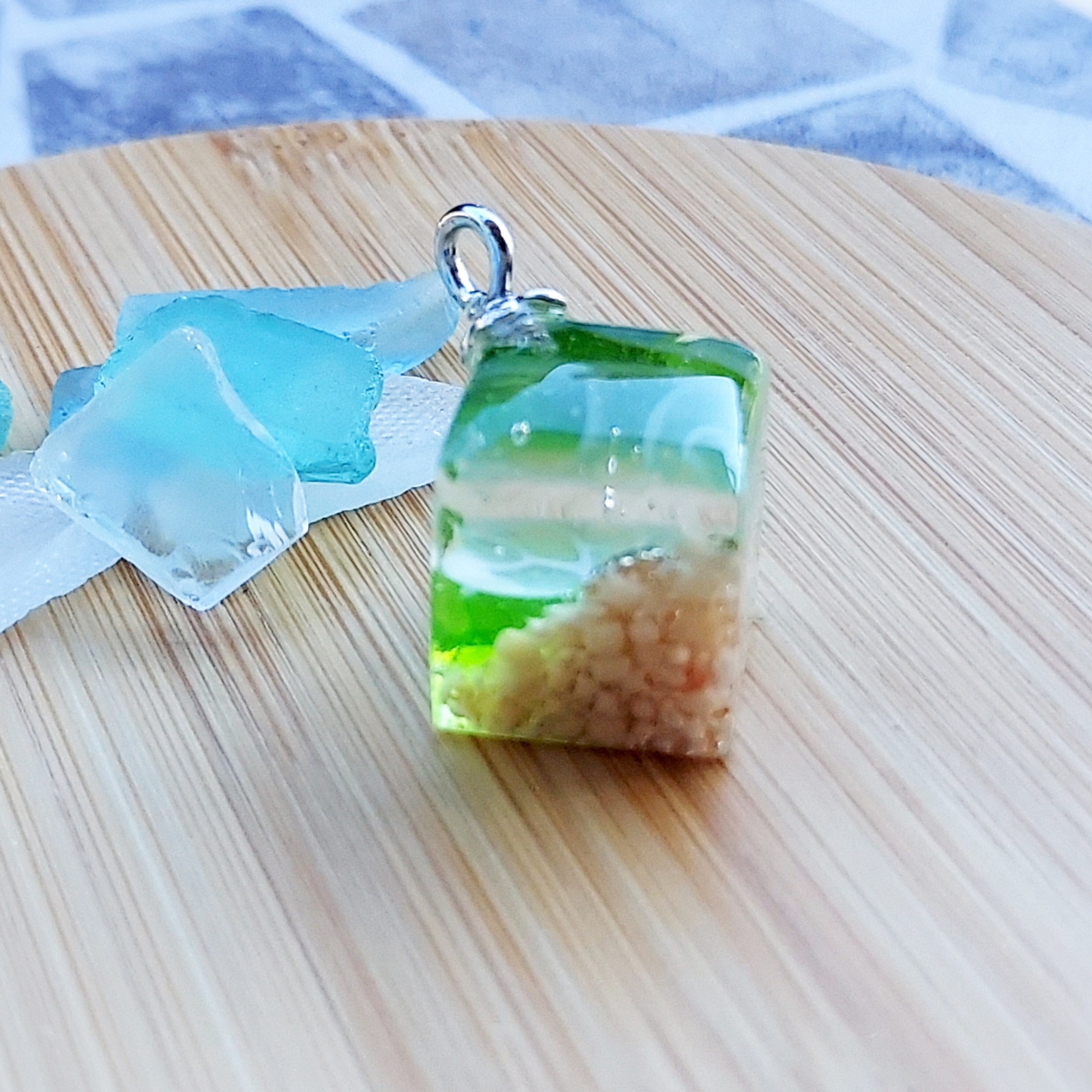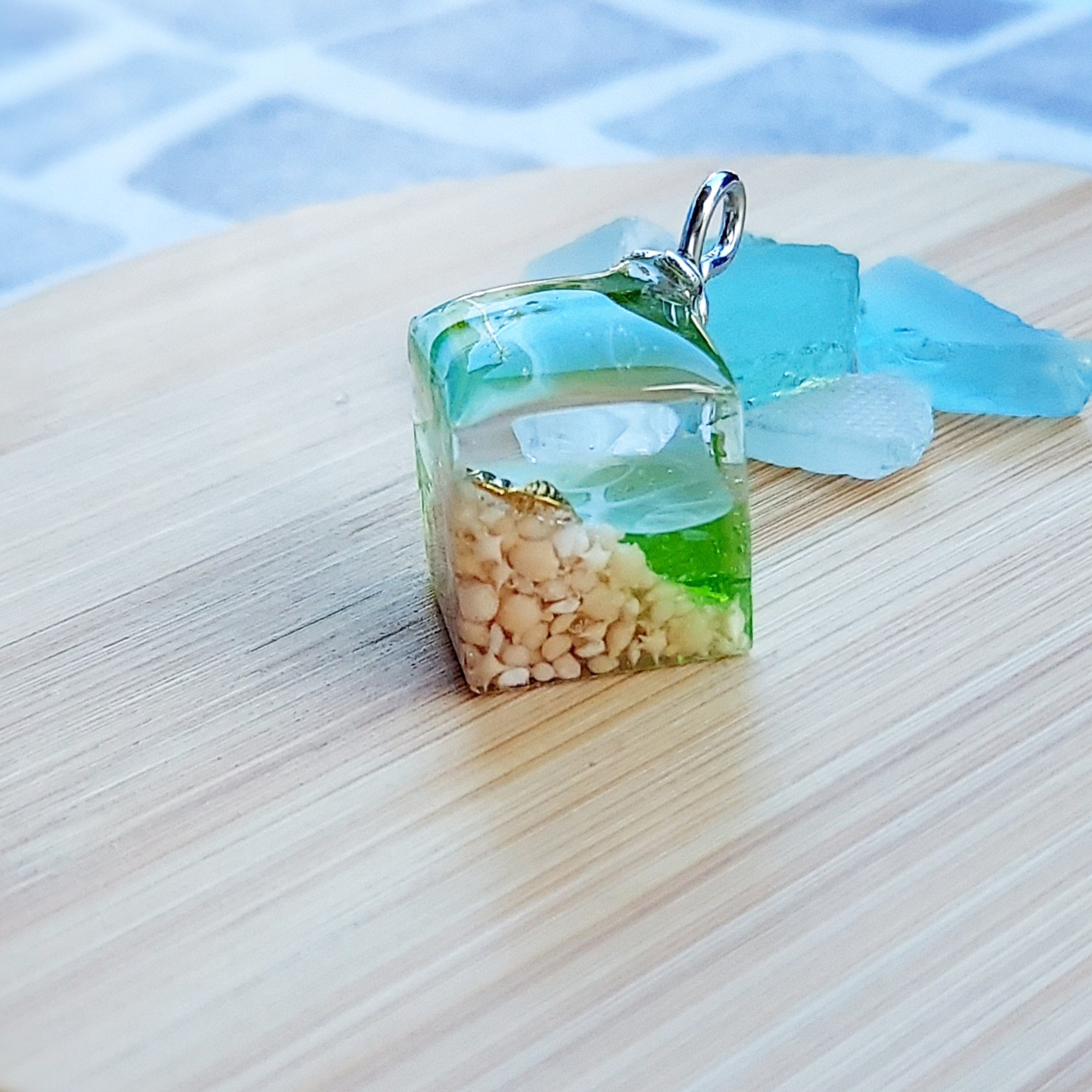 海の浜辺と波模様をキューブ型にとじ込めたネックレスです。