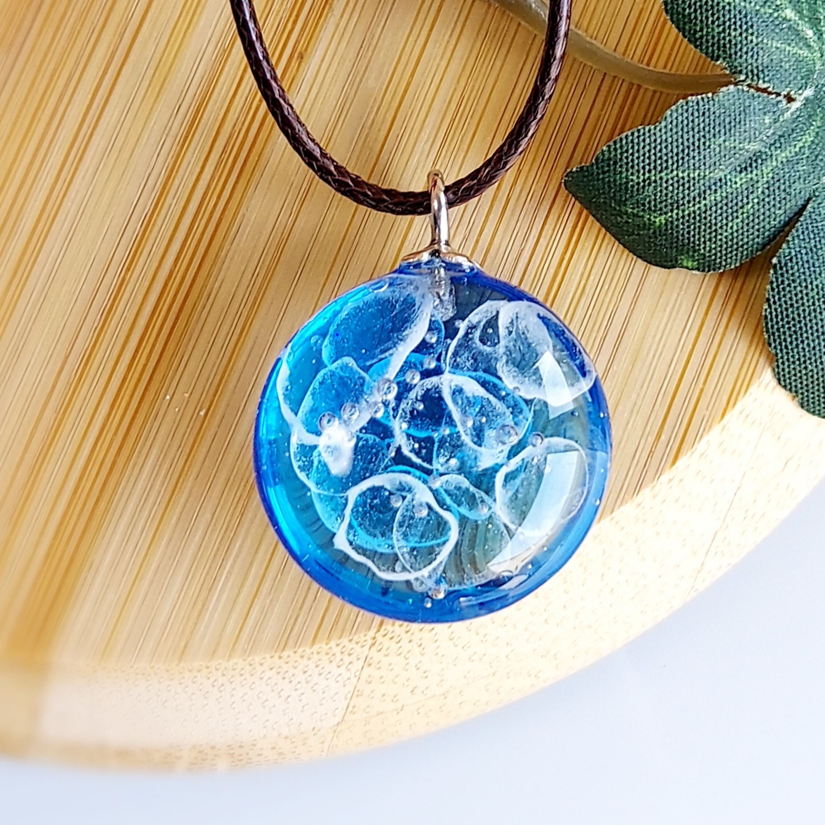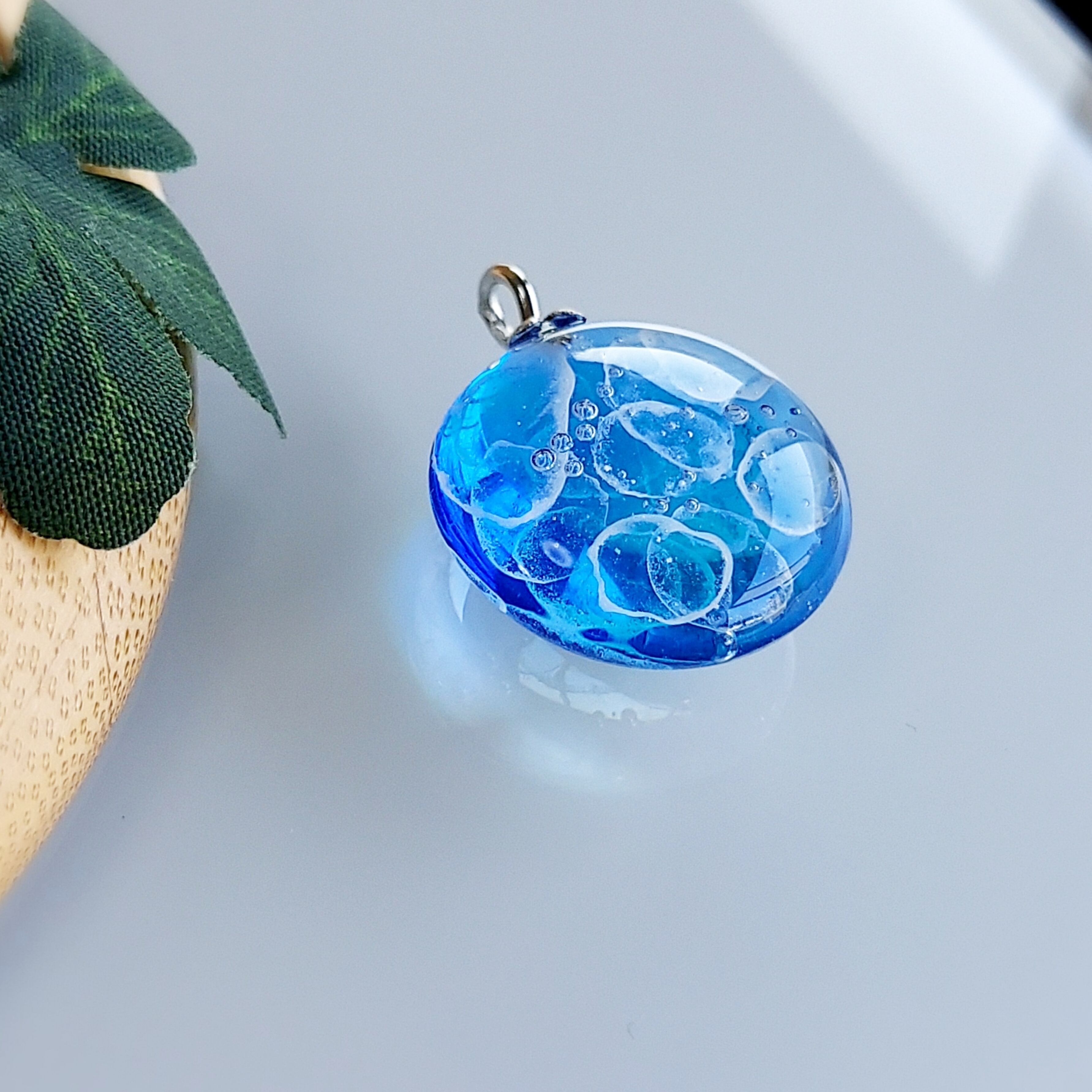 海を漂うクラゲをぷっくりサークル型にとじ込めたアクアリウムネックレスです。