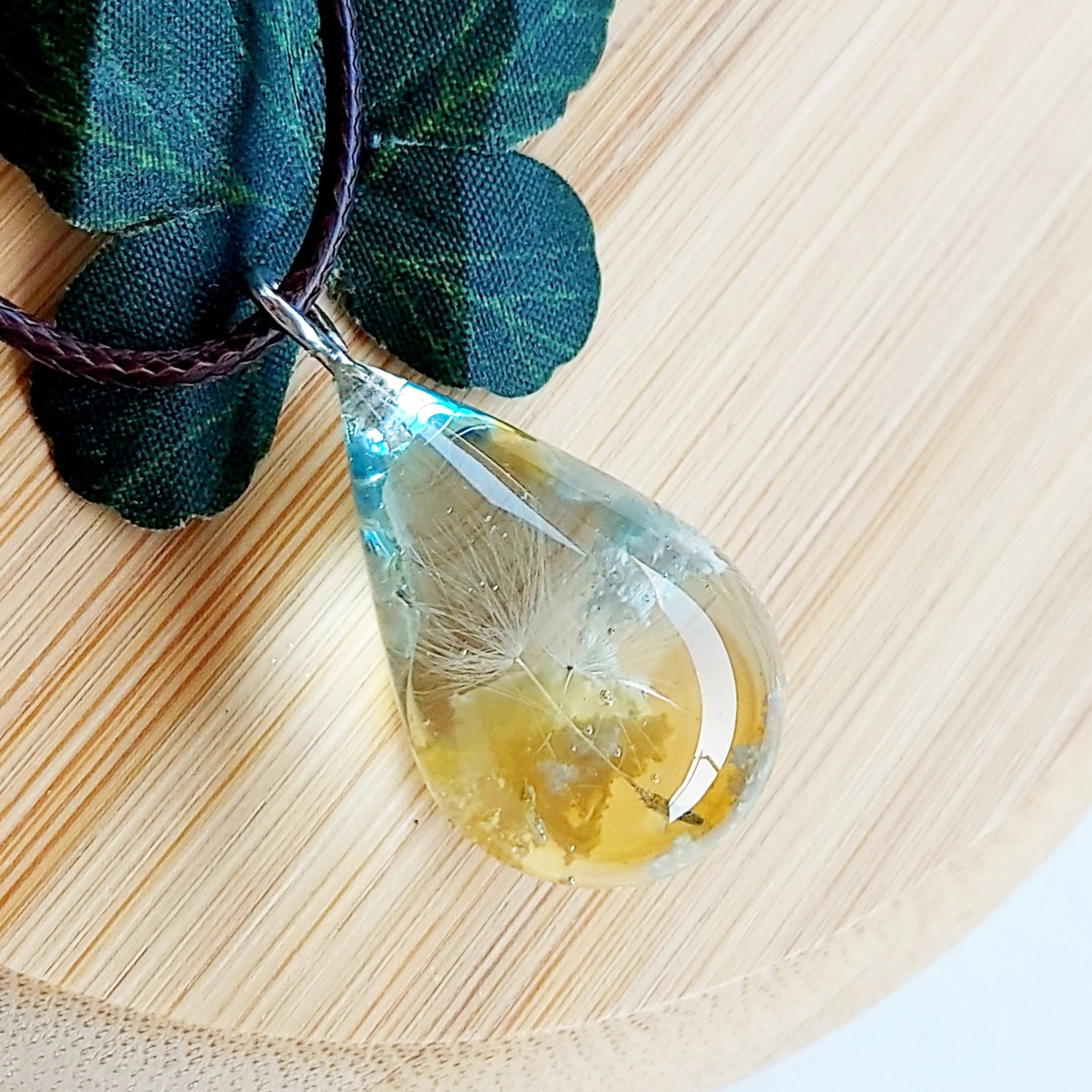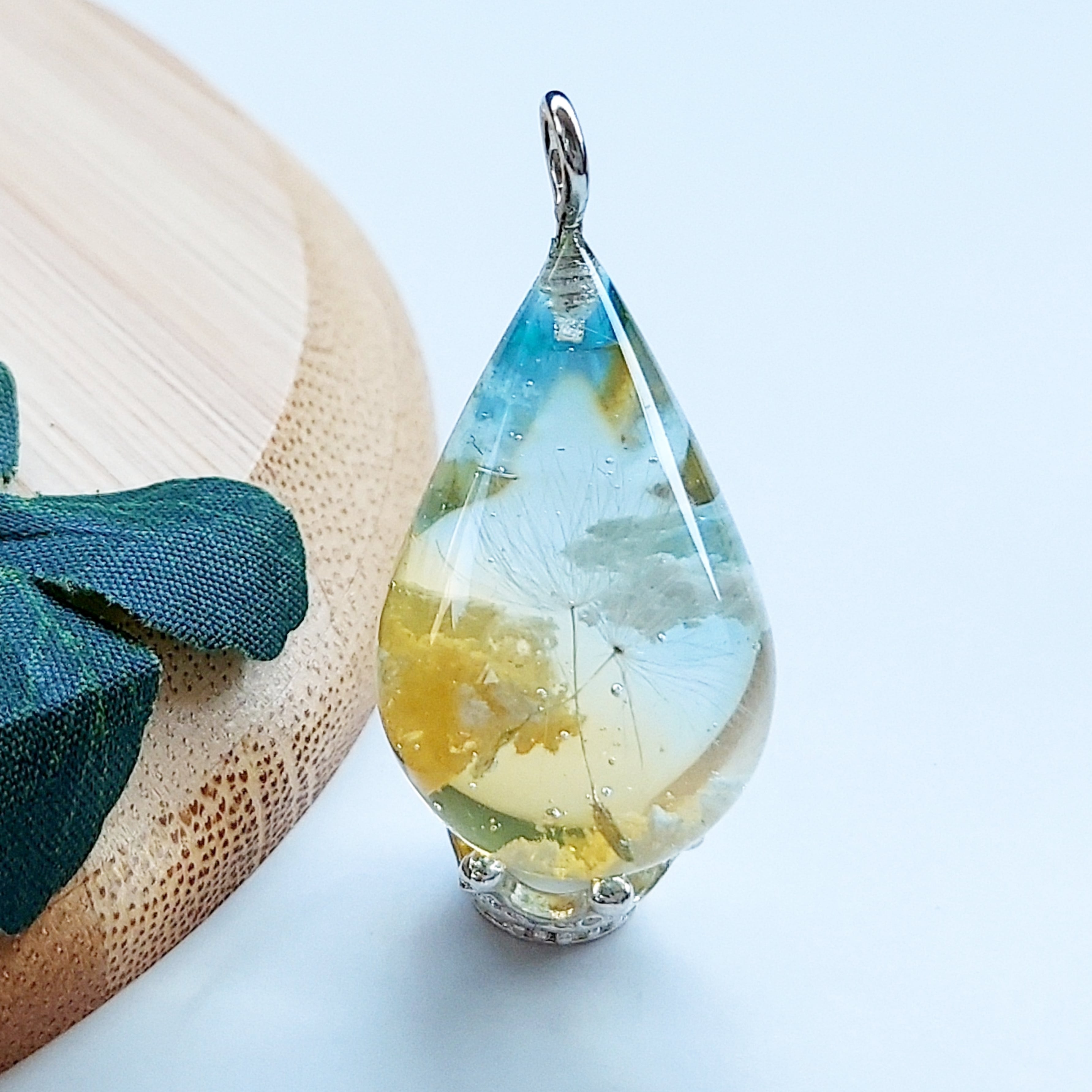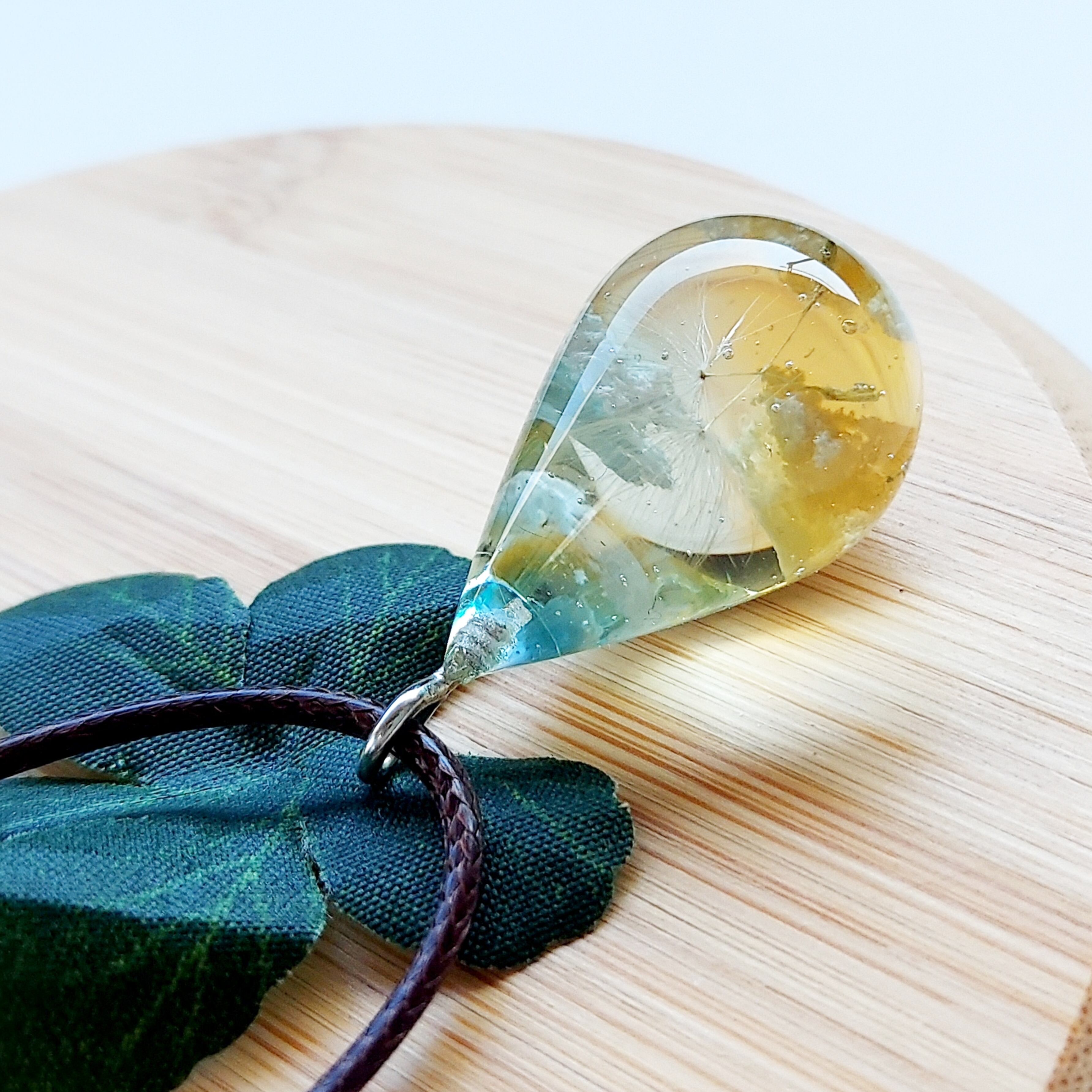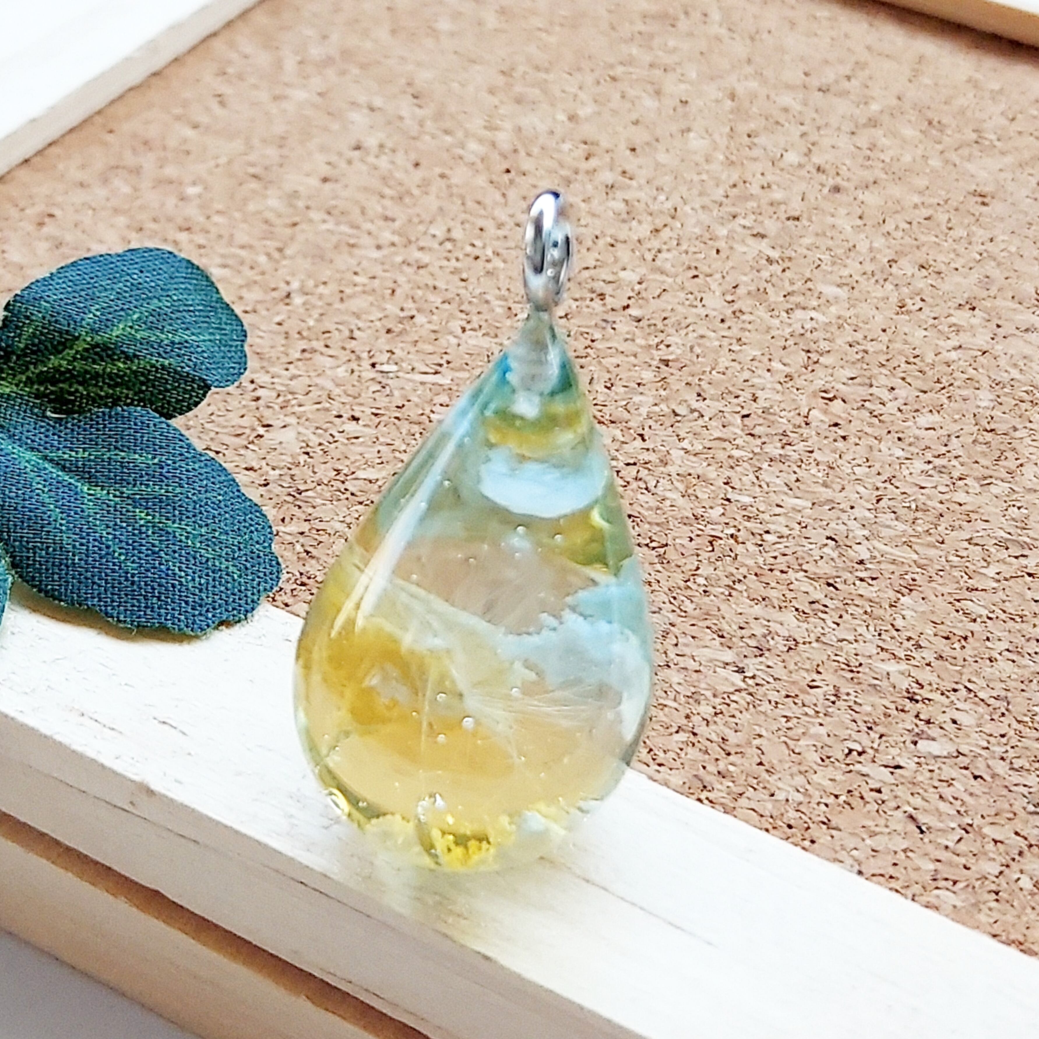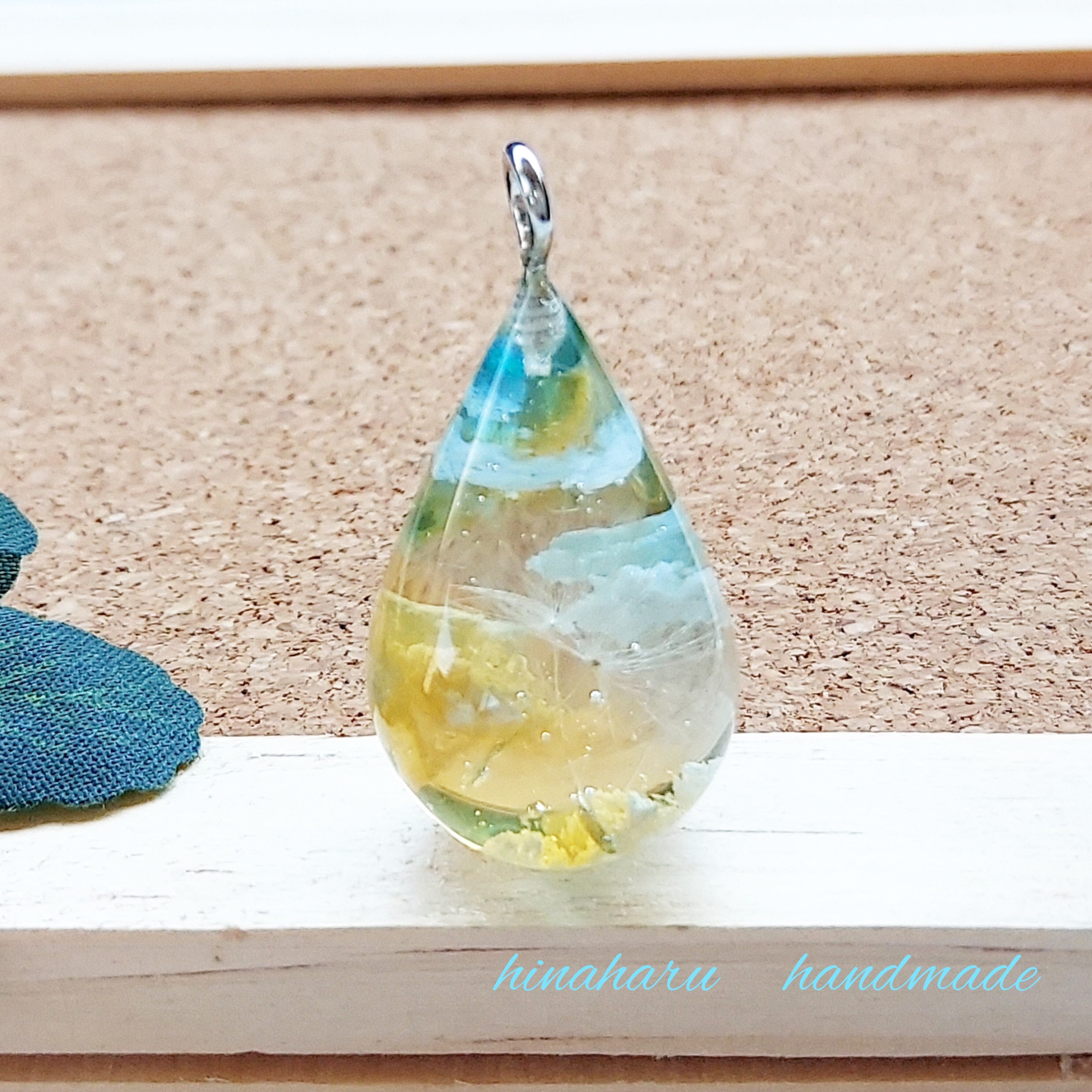 太陽が傾き、青空が翡翠色にそまってきた夕空にただようたんぽぽを、ドロップネックレスにしました。
