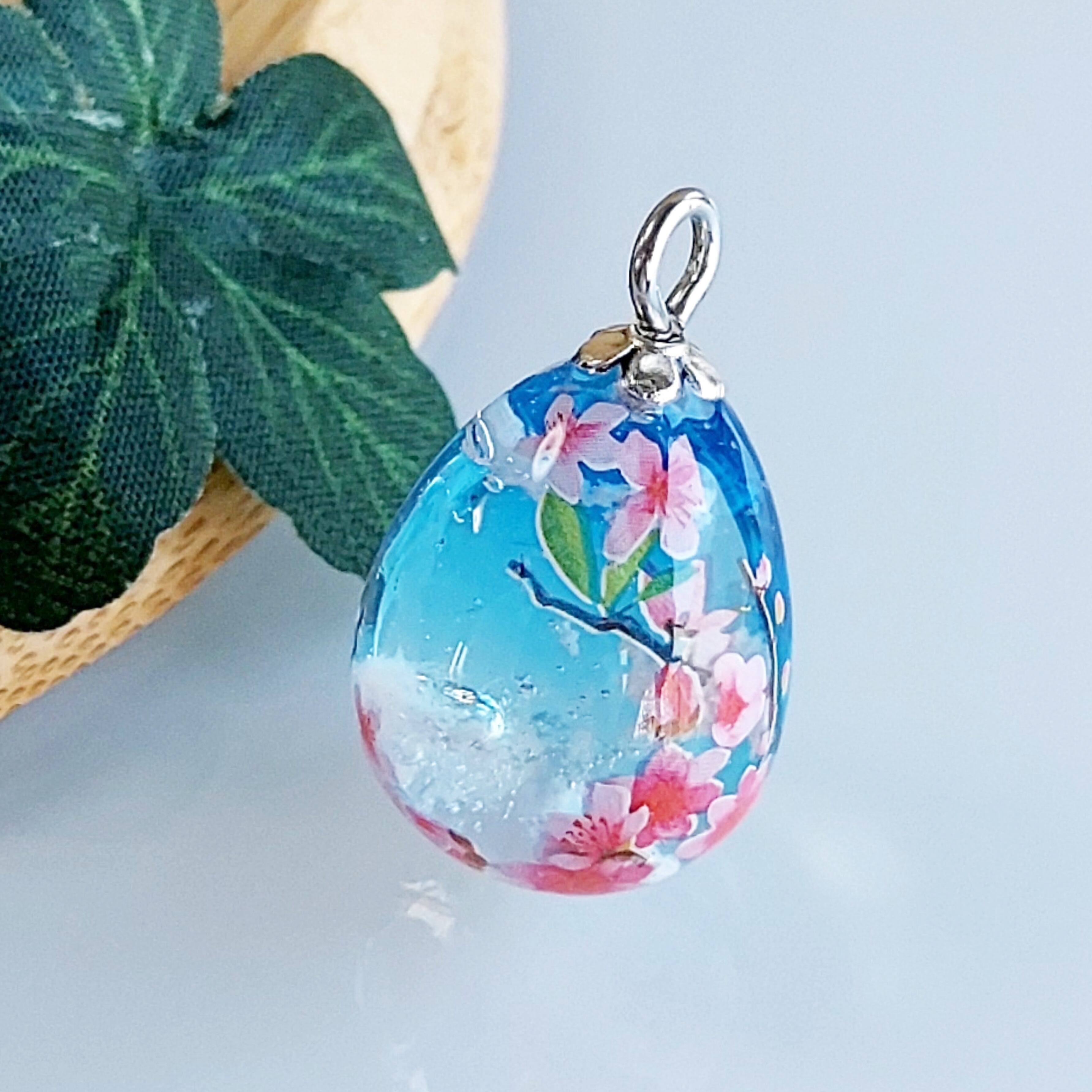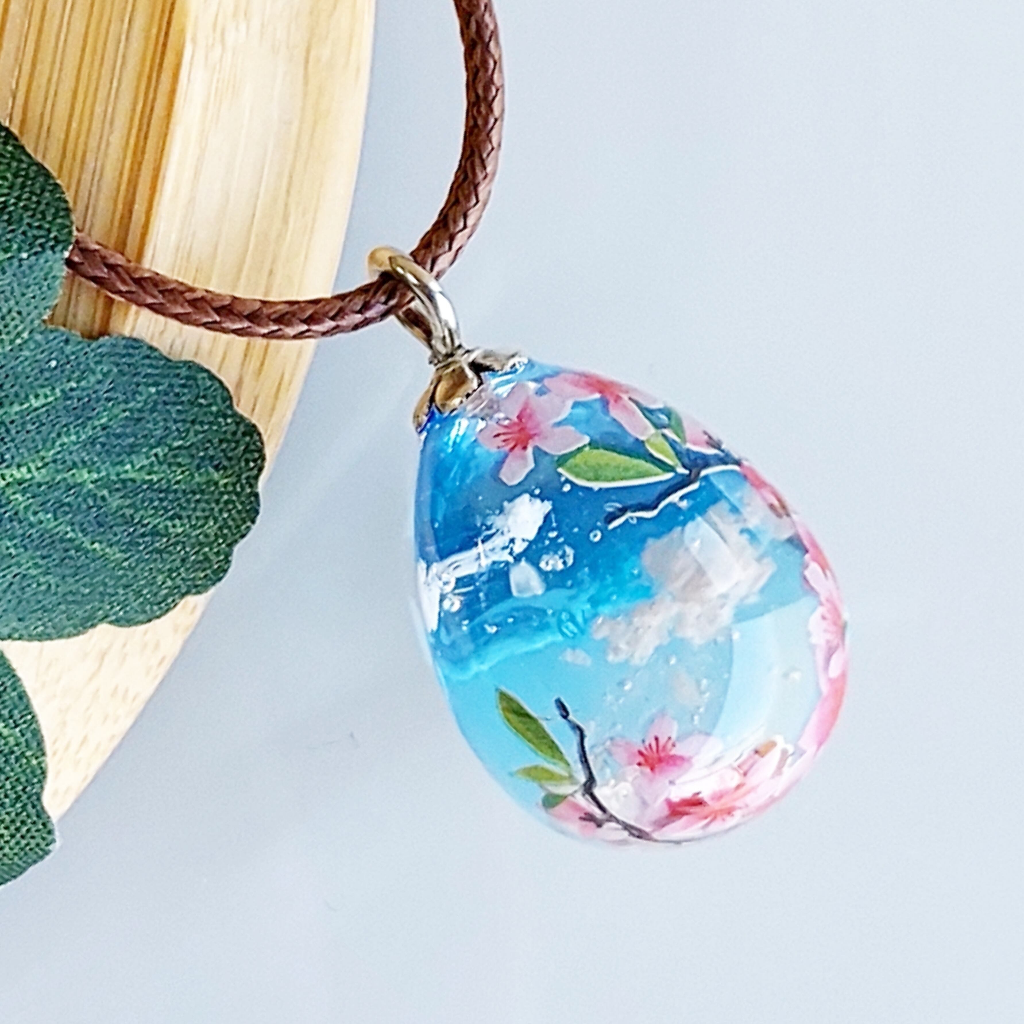 桜咲く青空をたまご型にとじ込めたネックレスです。