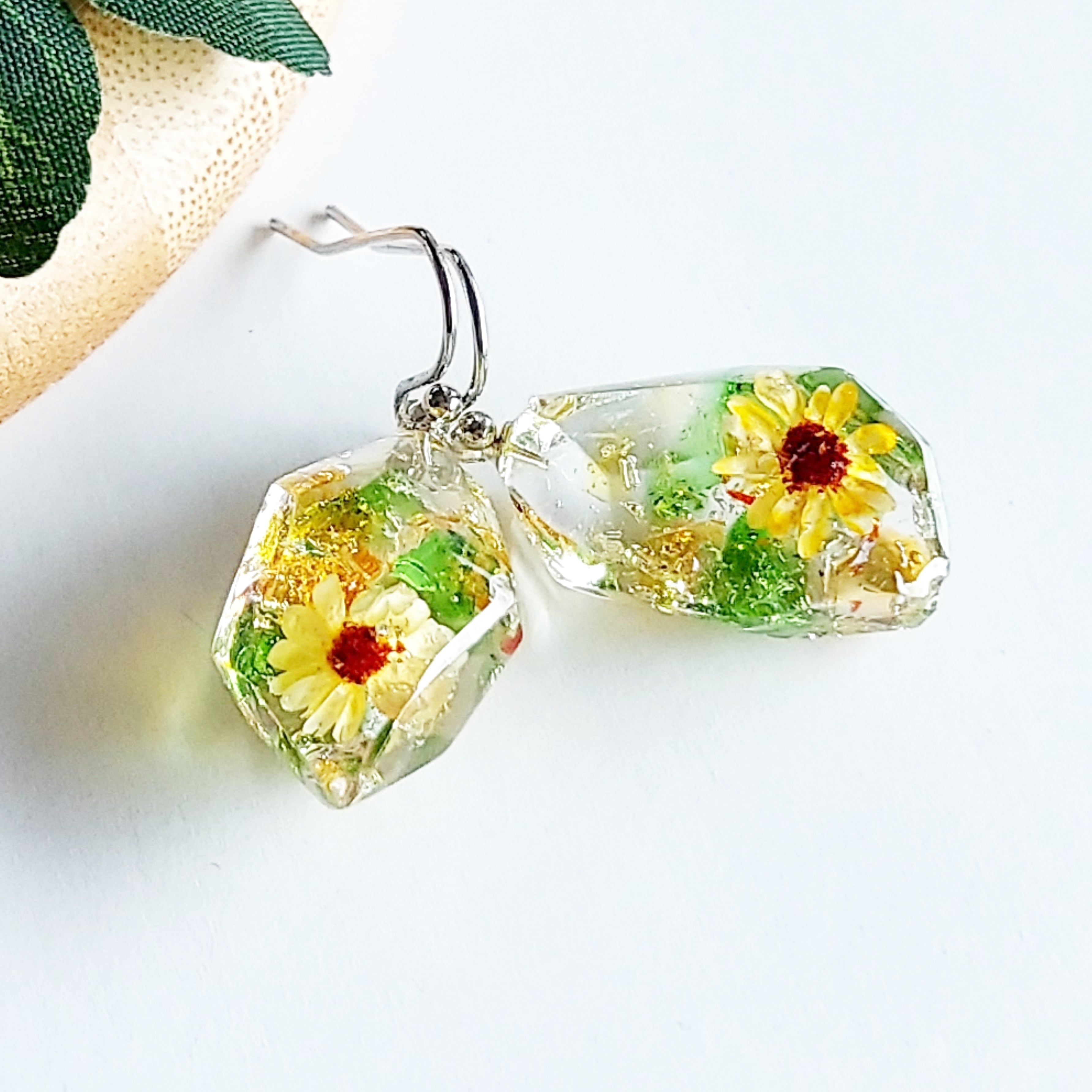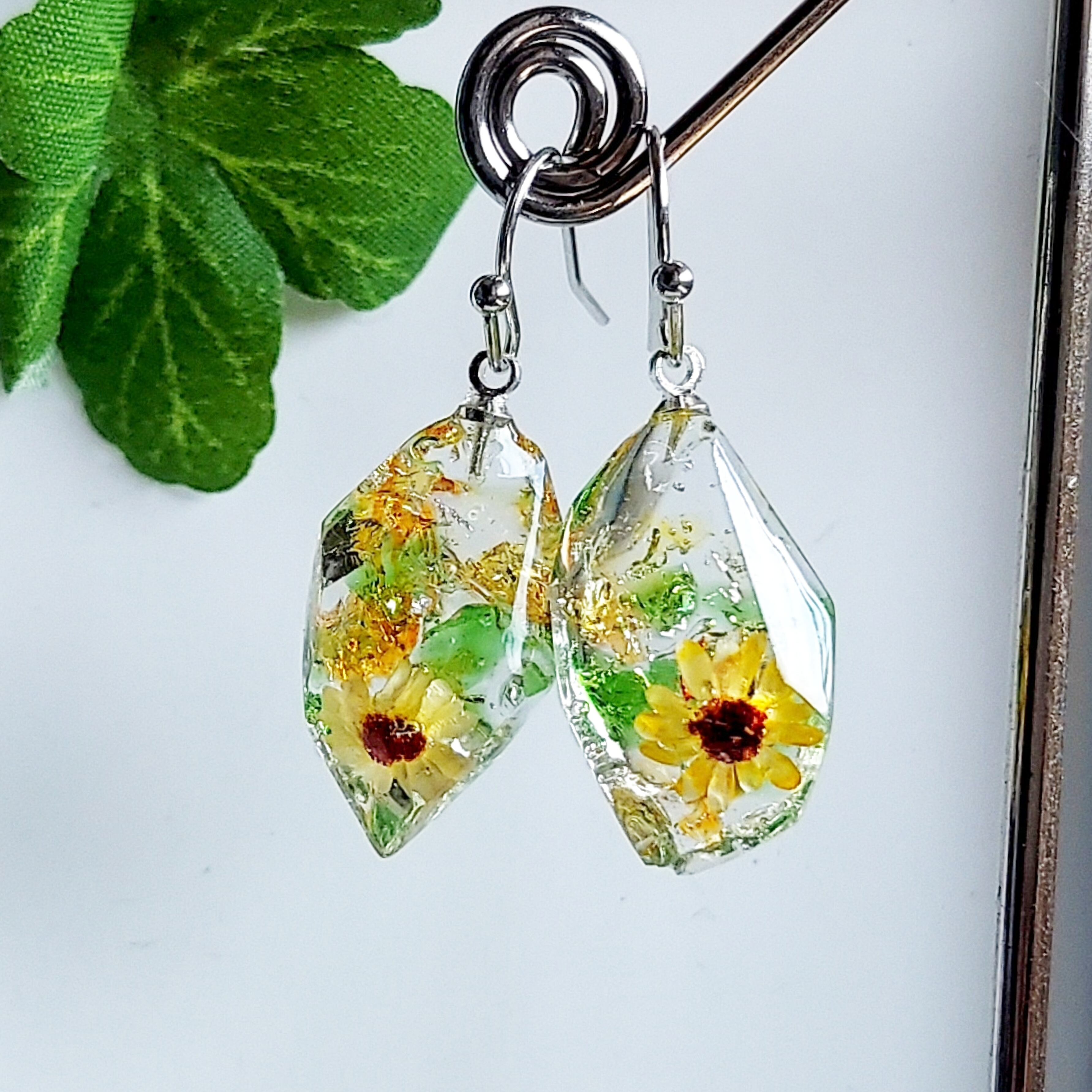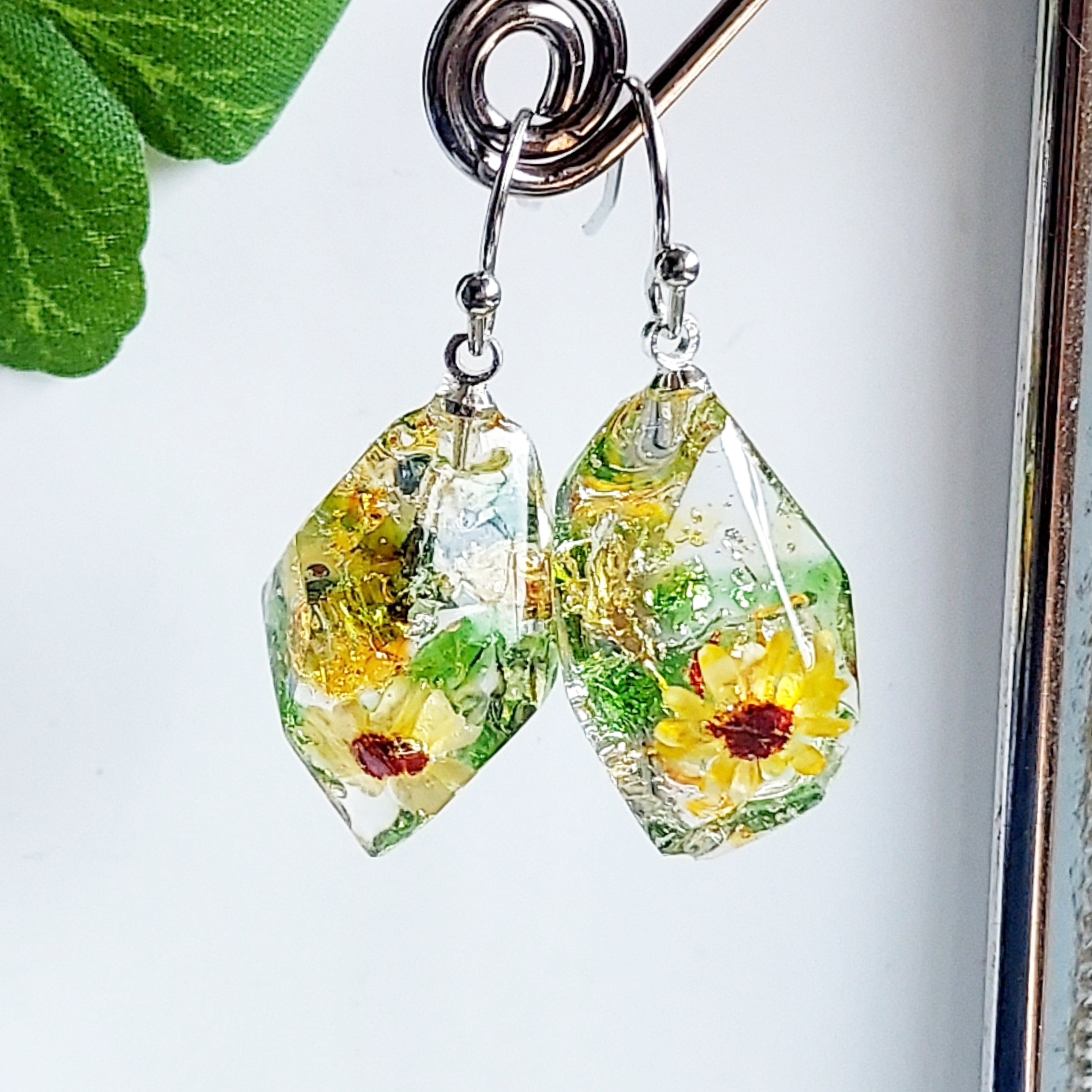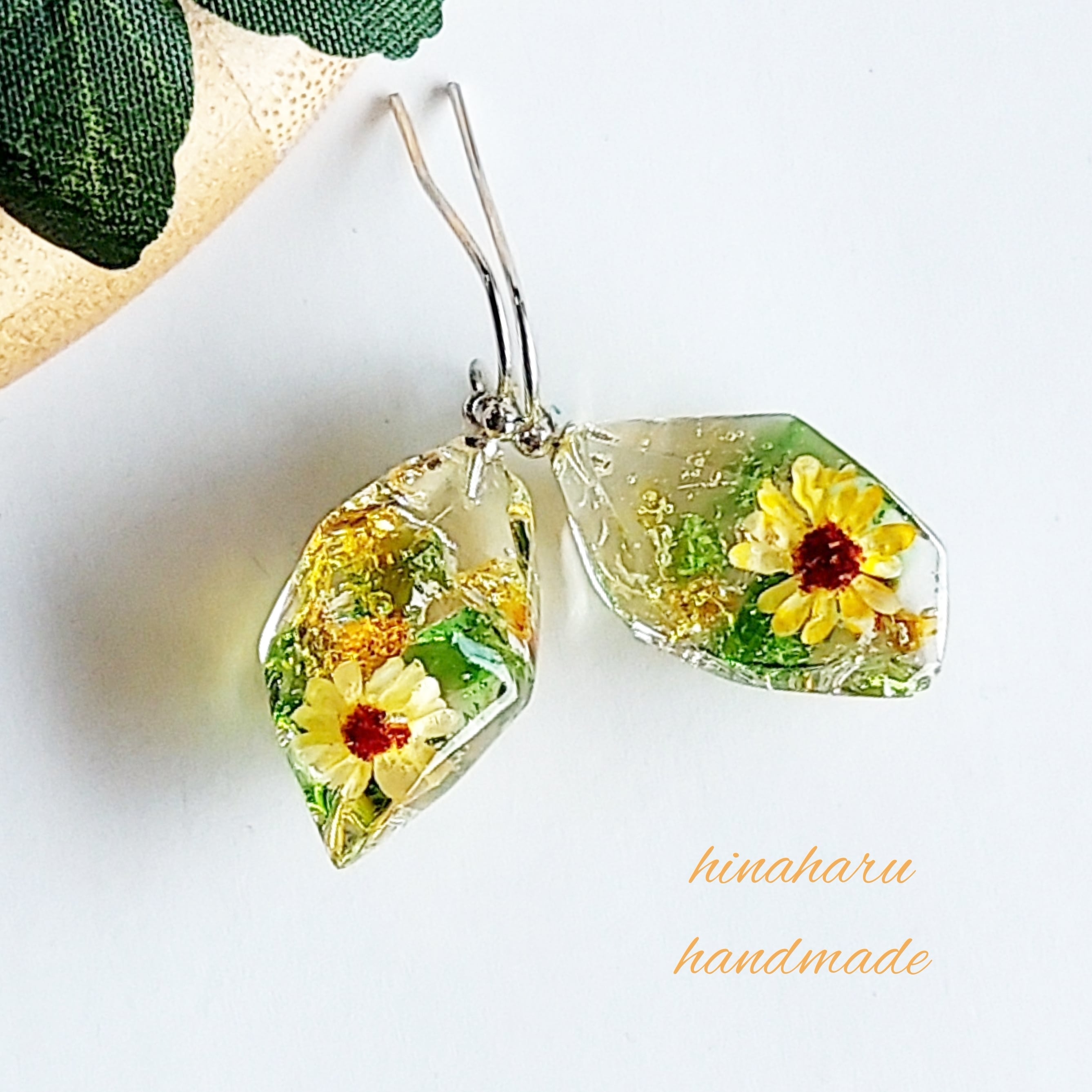 ひまわり(スターフラワーミニのひまわりカラーを使用しています)と、オレンジ、イエロー、グリーンのビタミンカラー琉球ガラスを鉱石の形のにとじ込めたピアスです。
