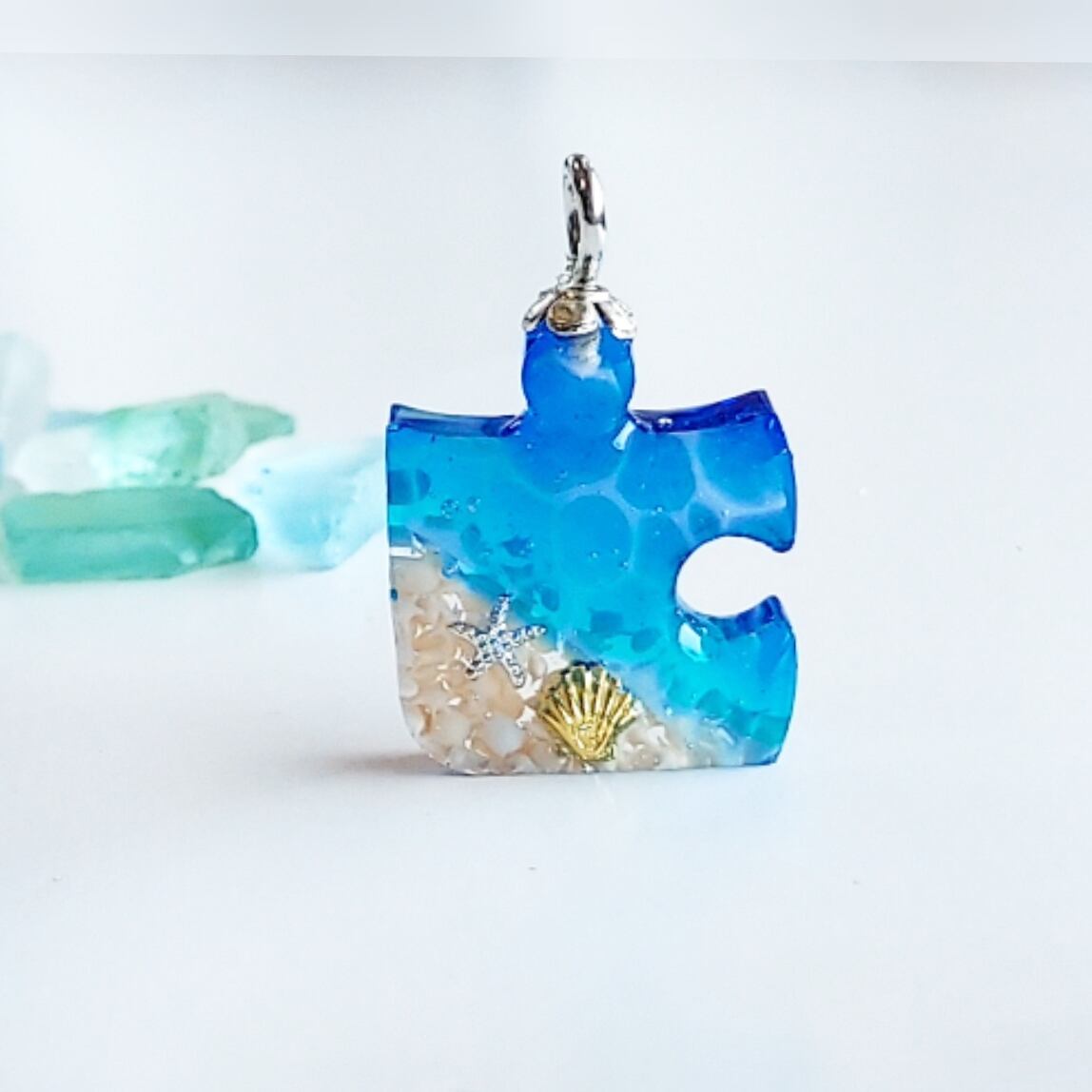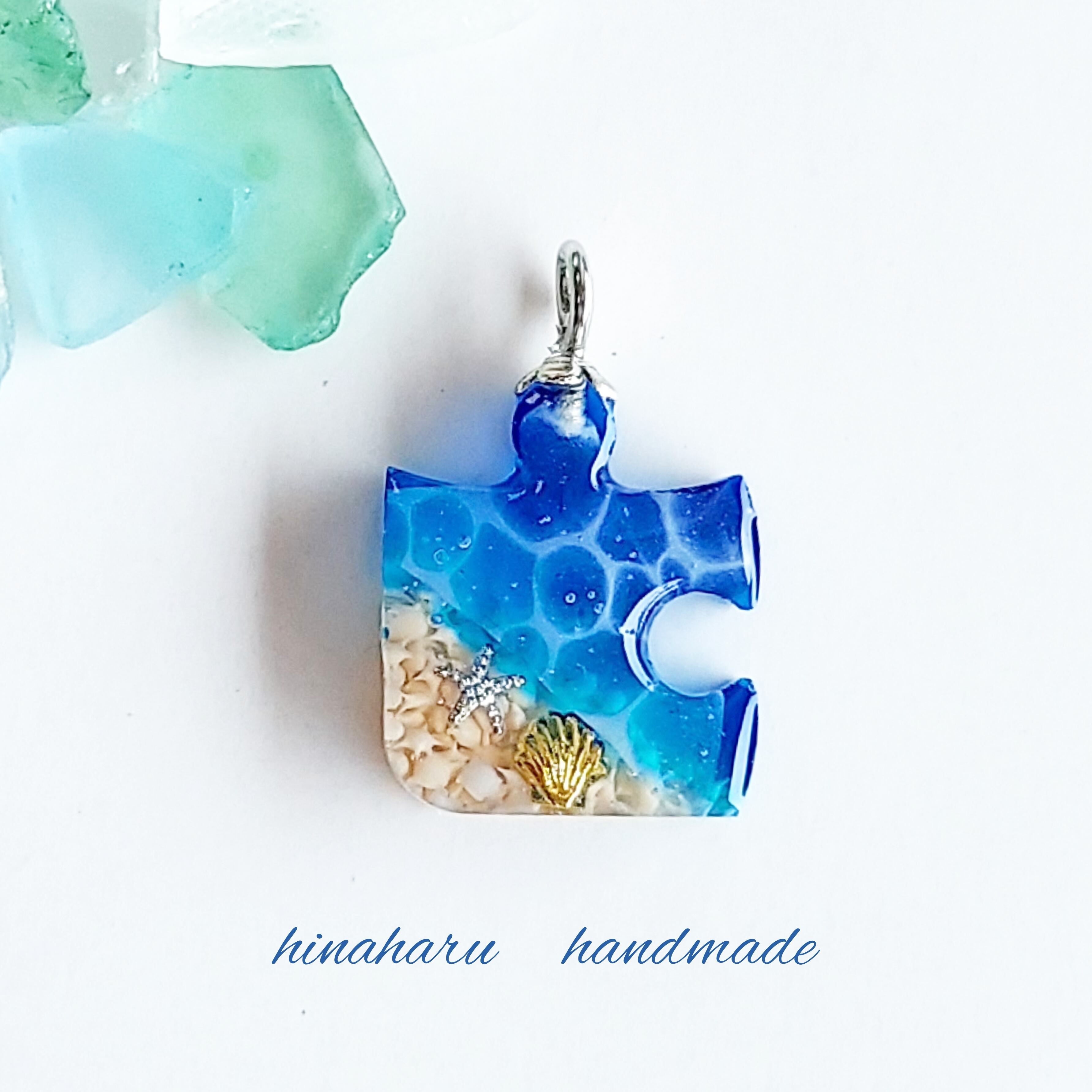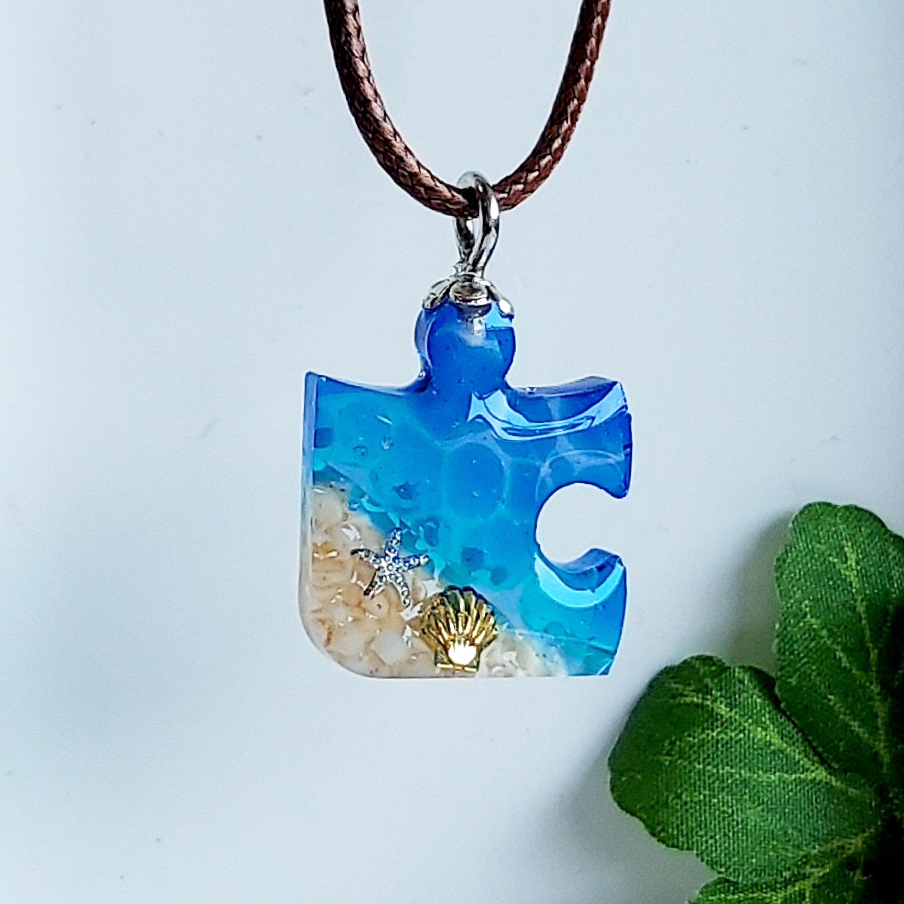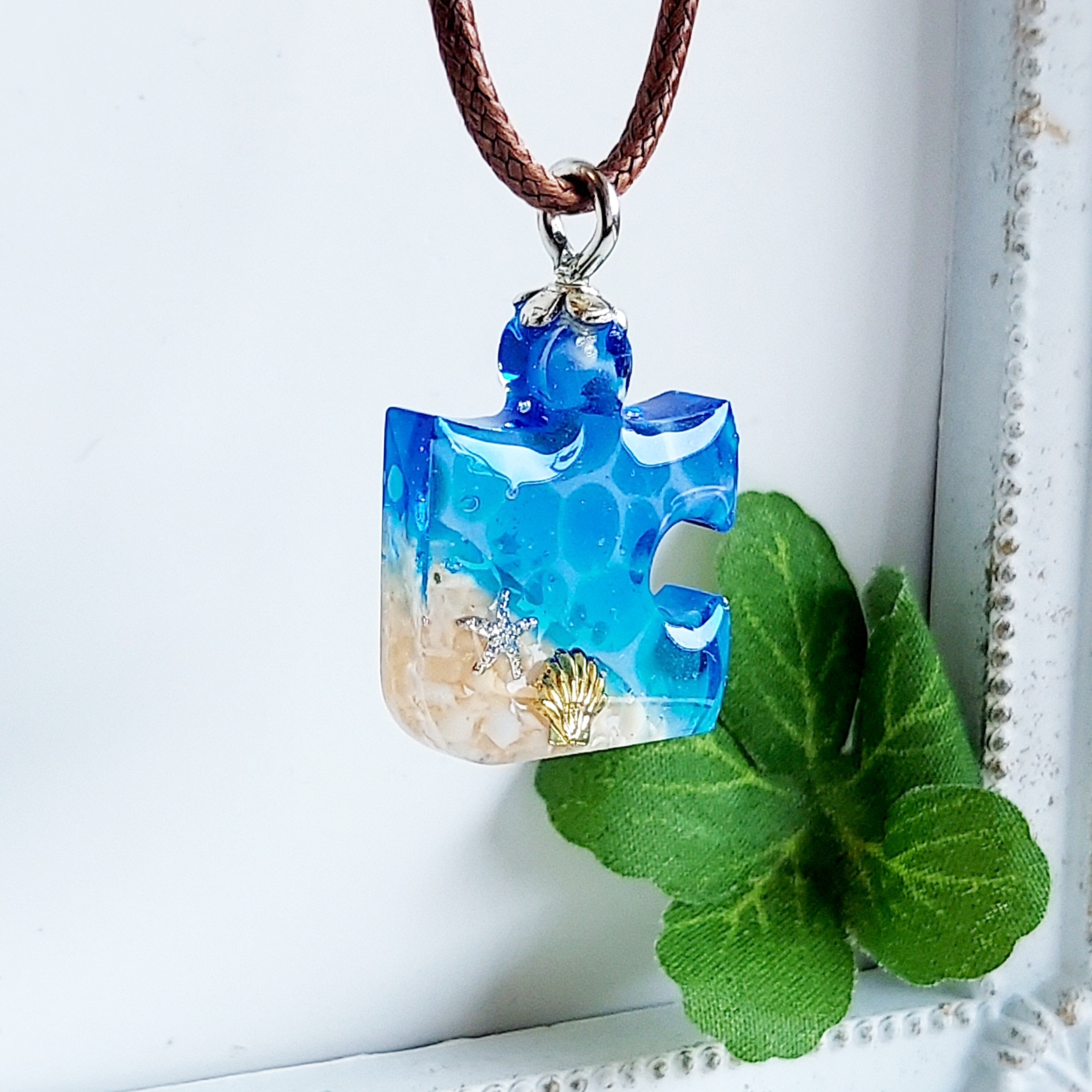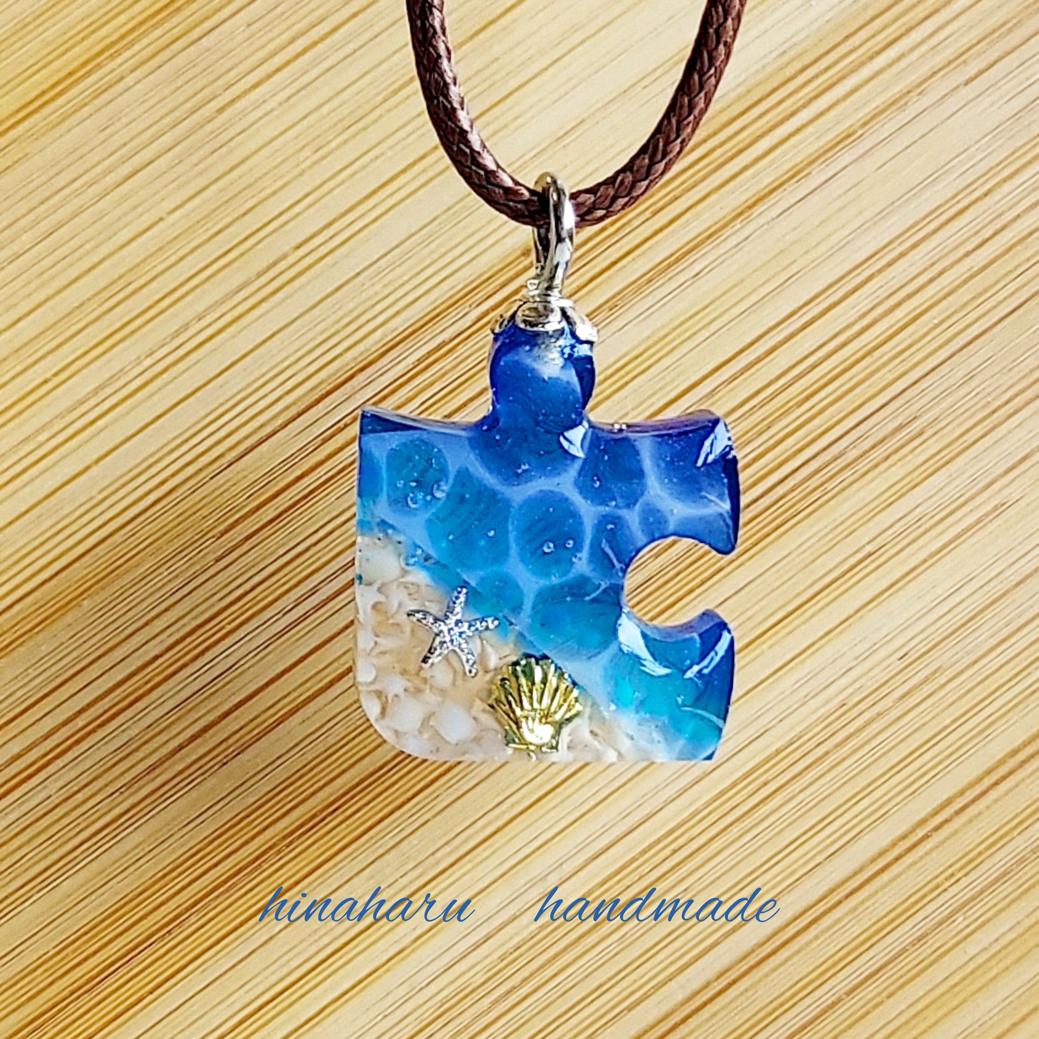 海の浜辺と波模様をジグソーパズル型にとじ込めたネックレスです。