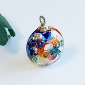 オレンジ、ライトブルー、ブルーのフラワーをぷっくりサークルにレジンでコーティングしたネックレスです。