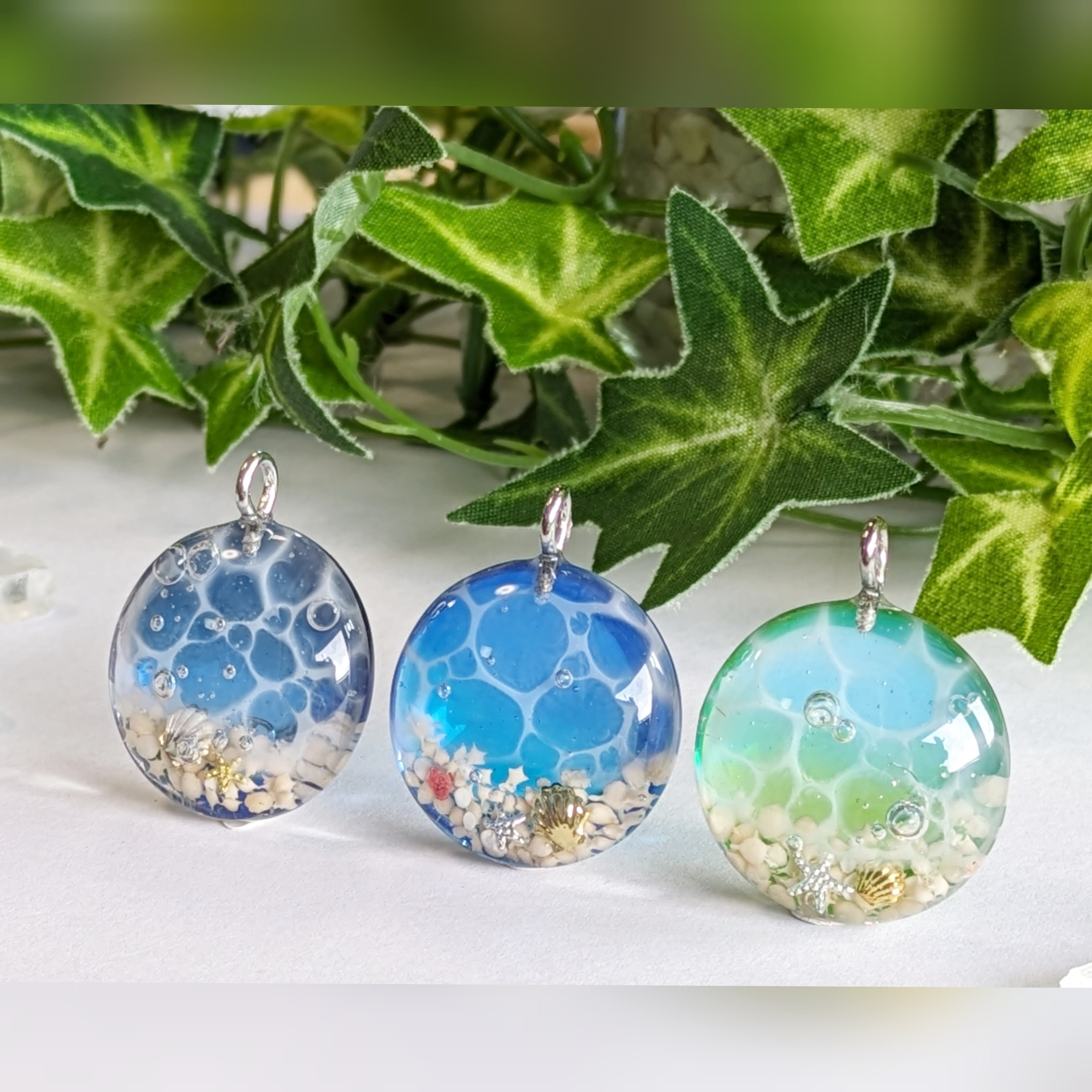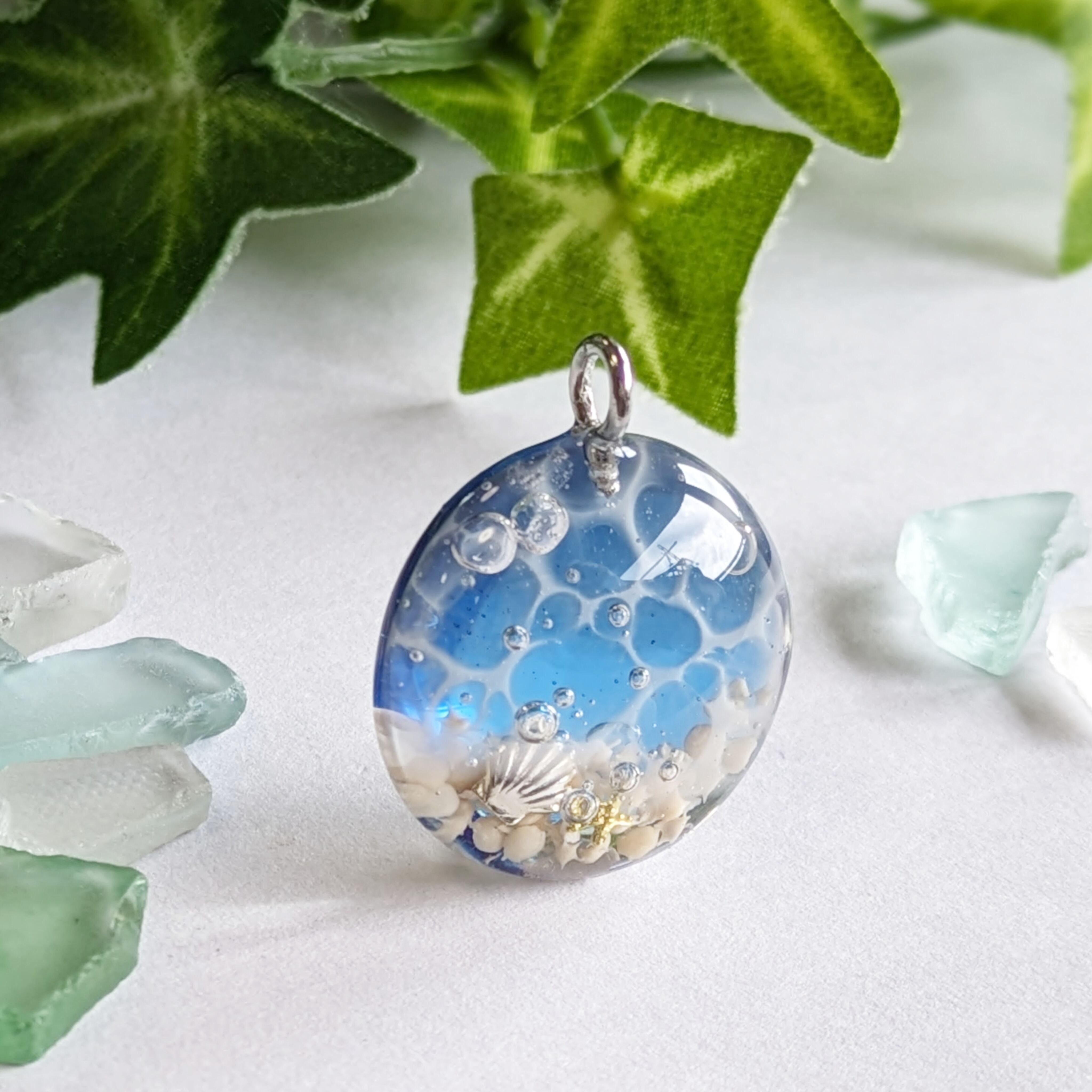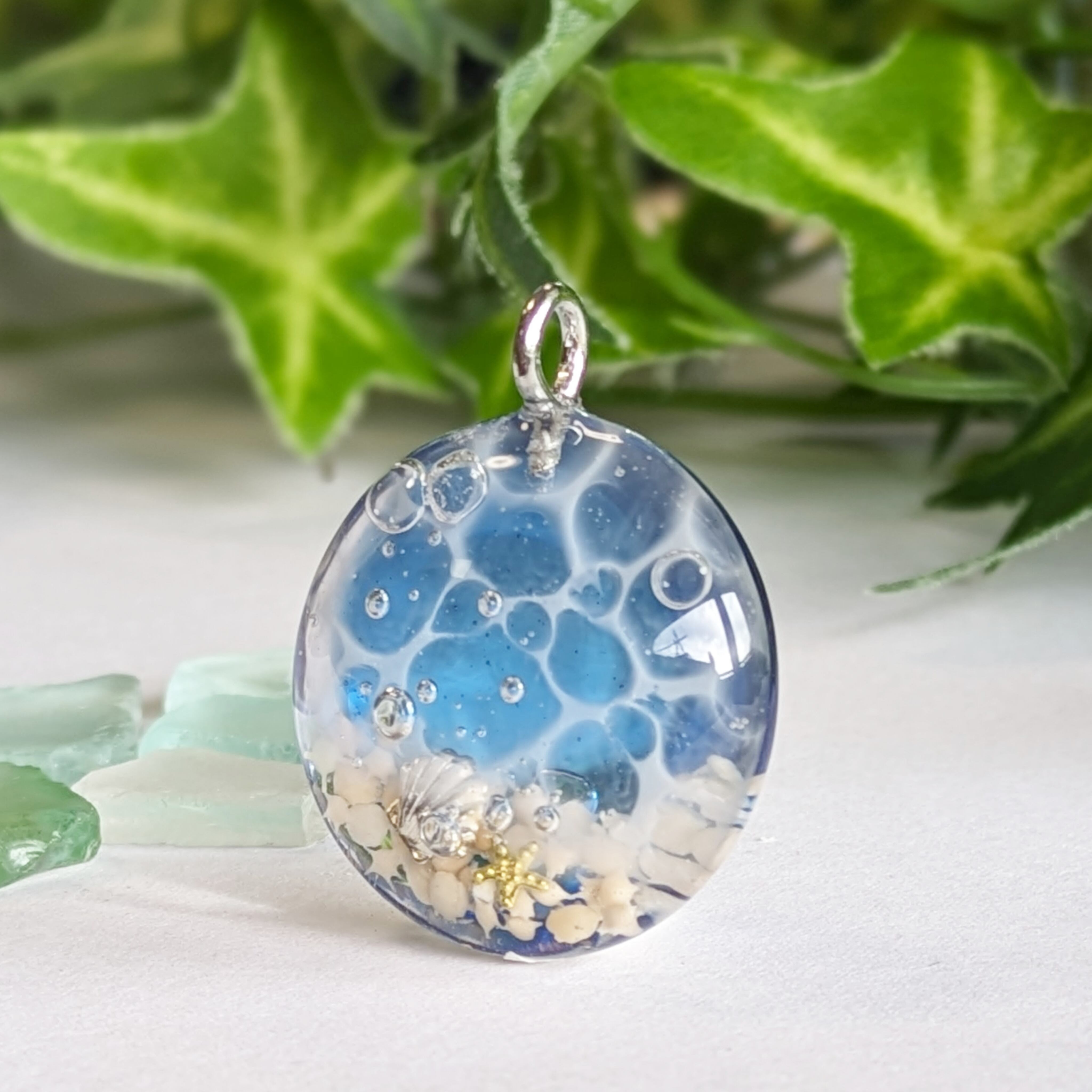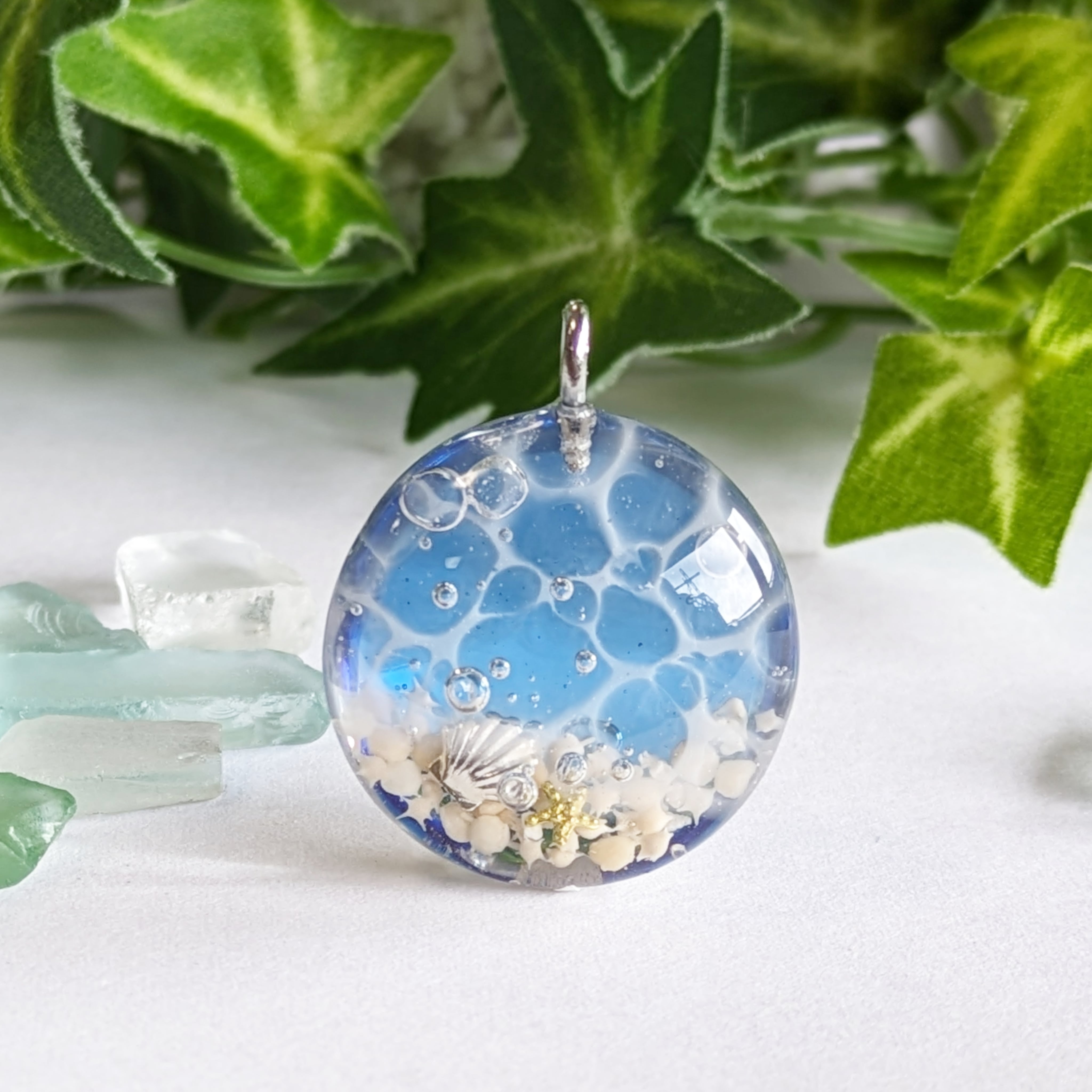 海の浜辺と波模様をぷっくりサークル型にとじ込めたネックレスです。