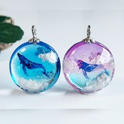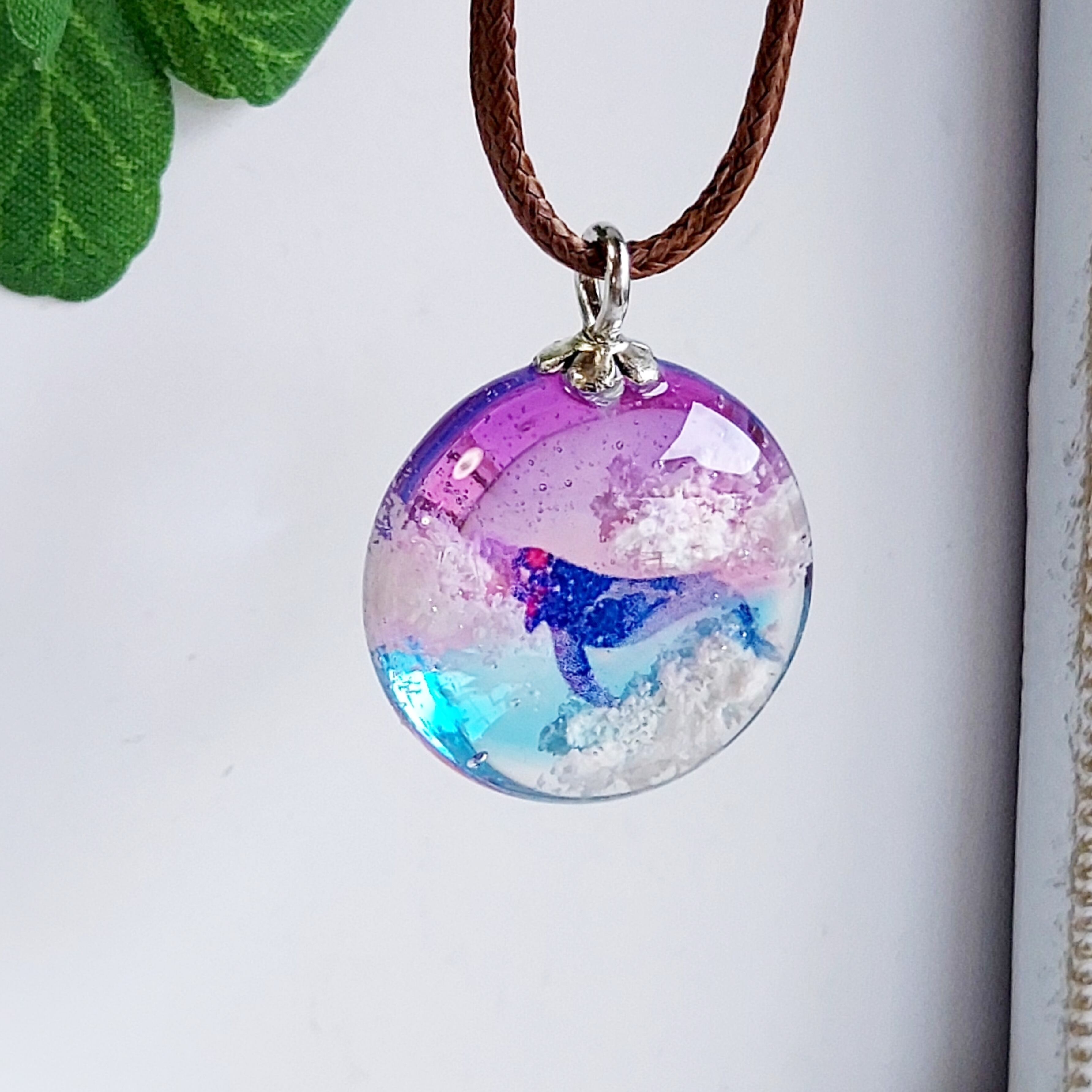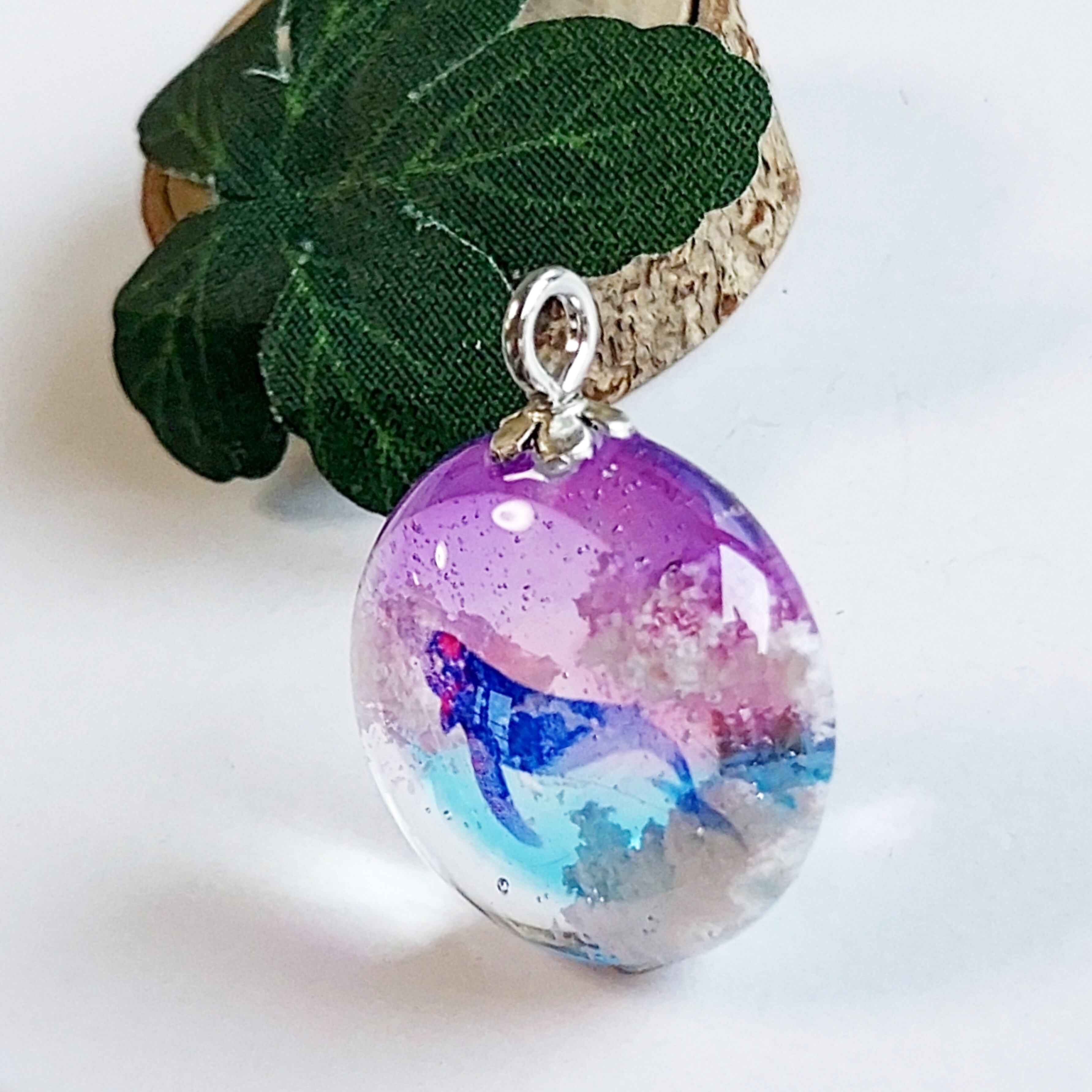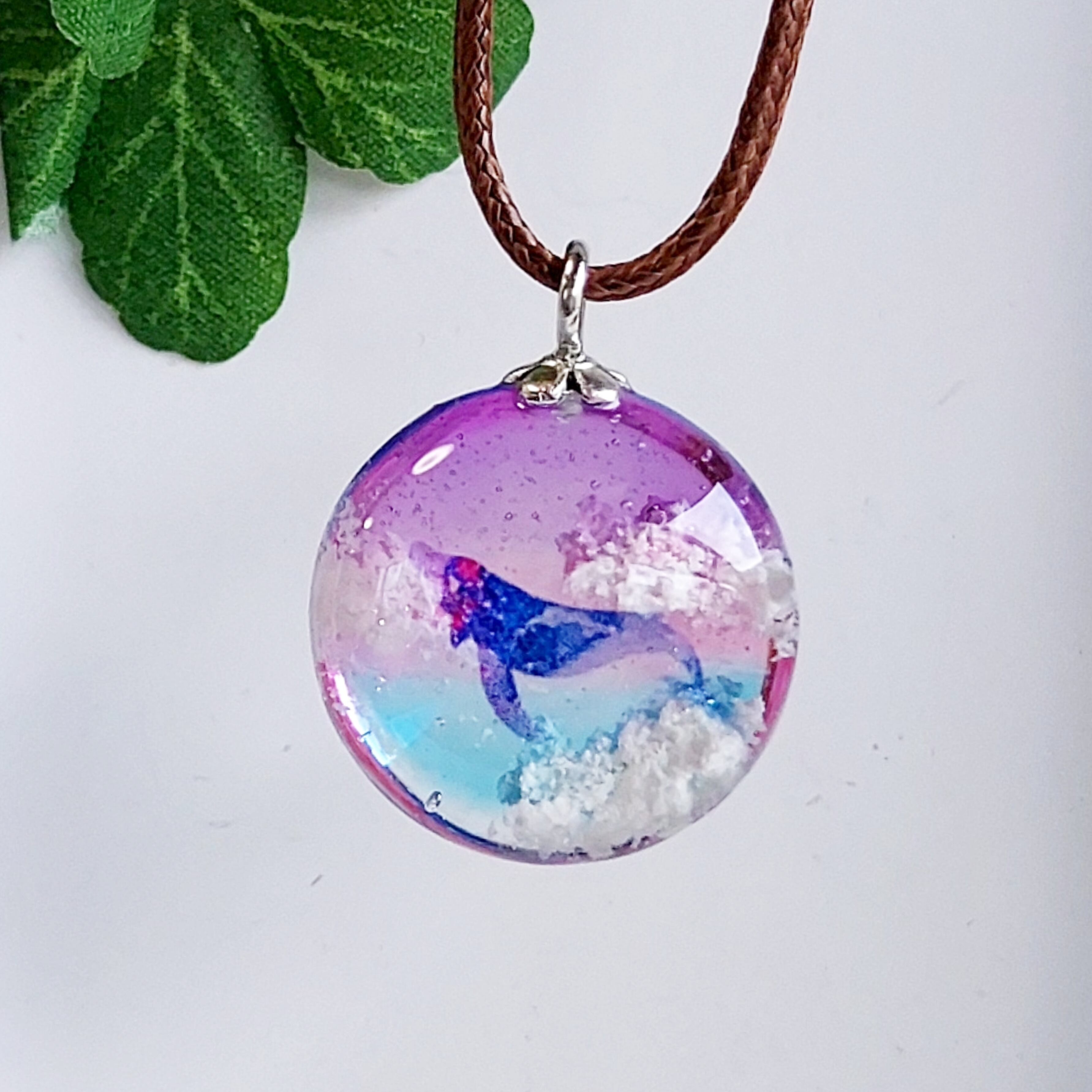 茜空と雲をぷっくりサークル型にとじ込め、空飛ぶくじらを合わせたネックレスです。