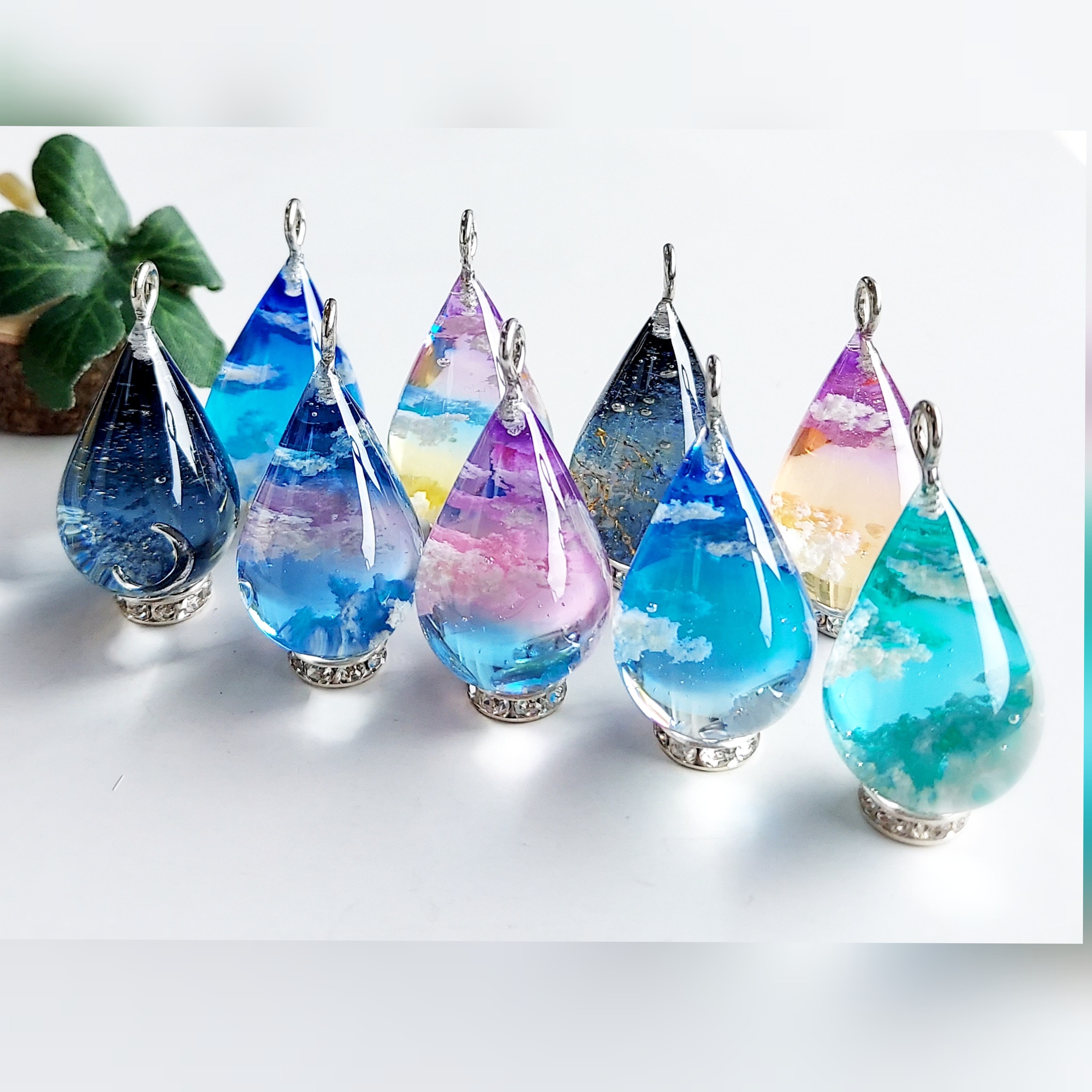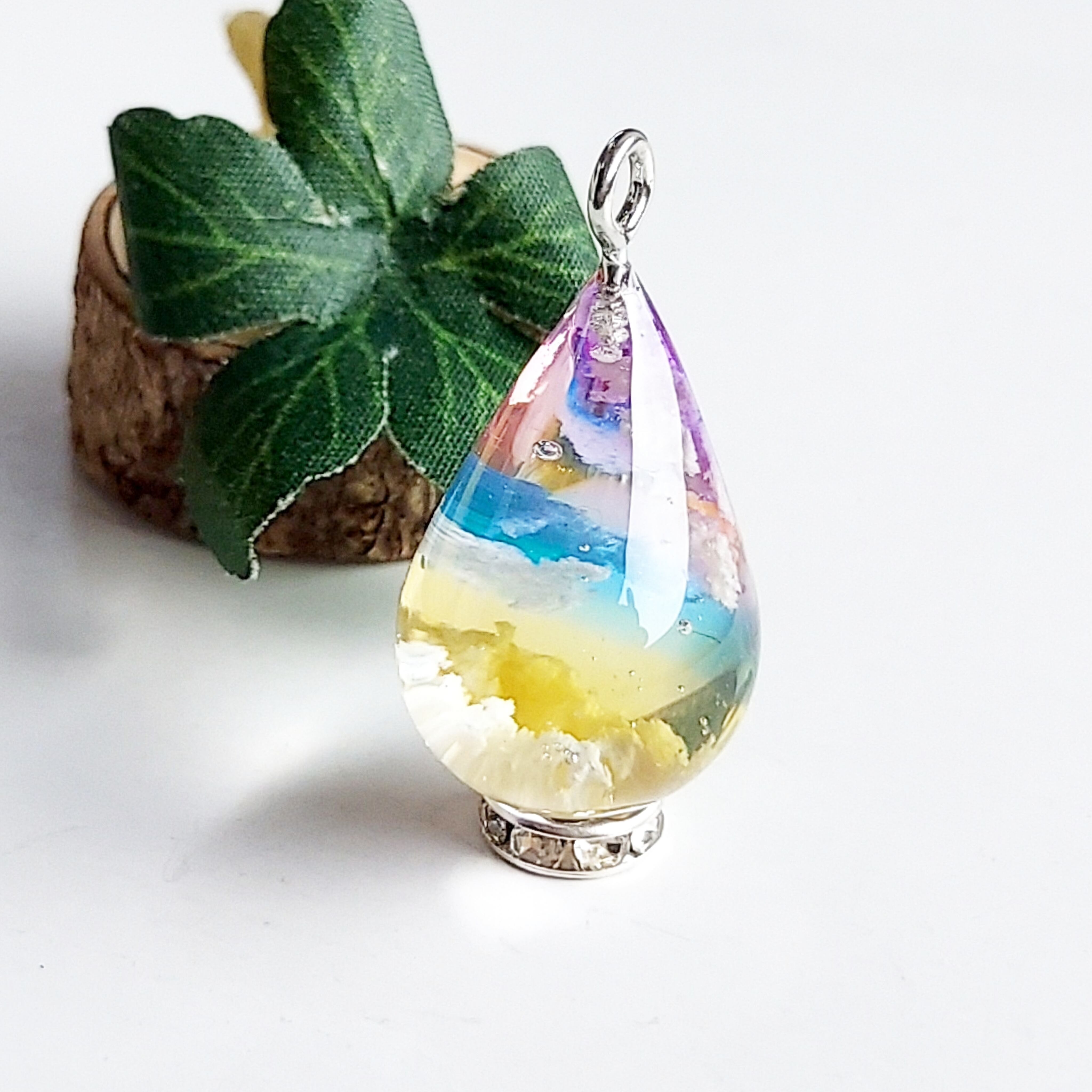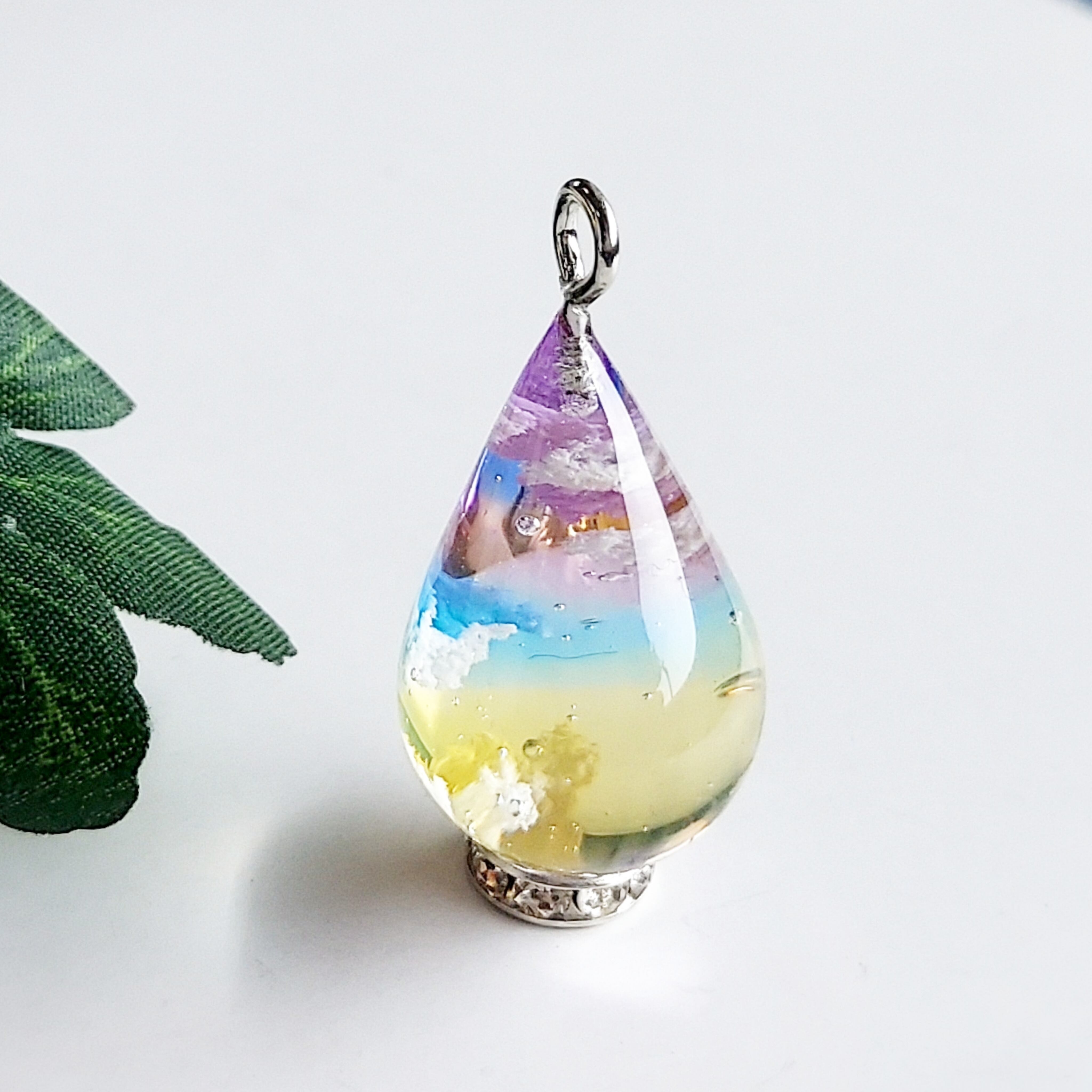 夜が明けて、太陽が顔を出す前の暁の空と雲をドロップ型にとじ込めたネックレスです。