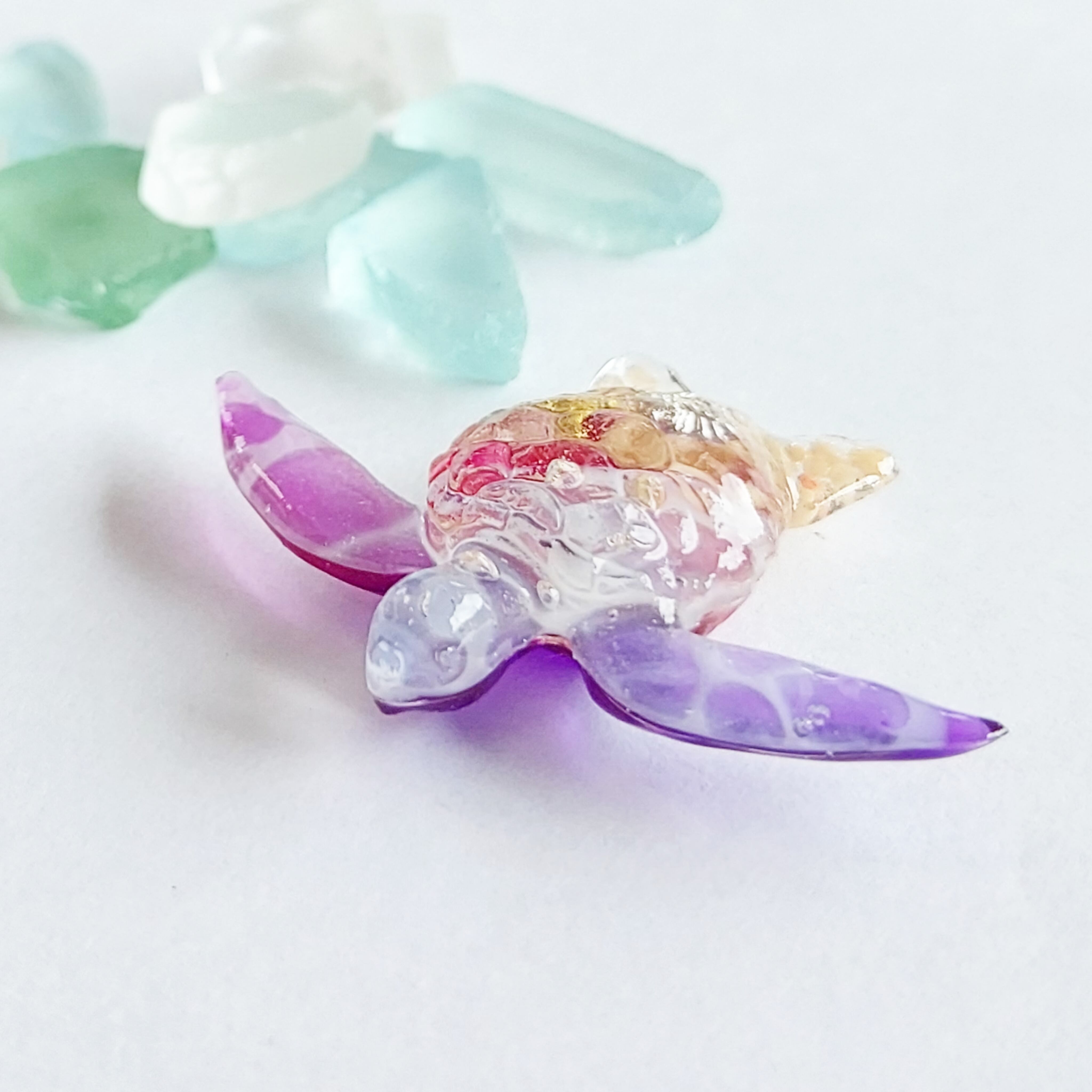 ホヌ(海ガメ)の中に、海の浜辺と波模様をとじ込め、虹色を合わせました。