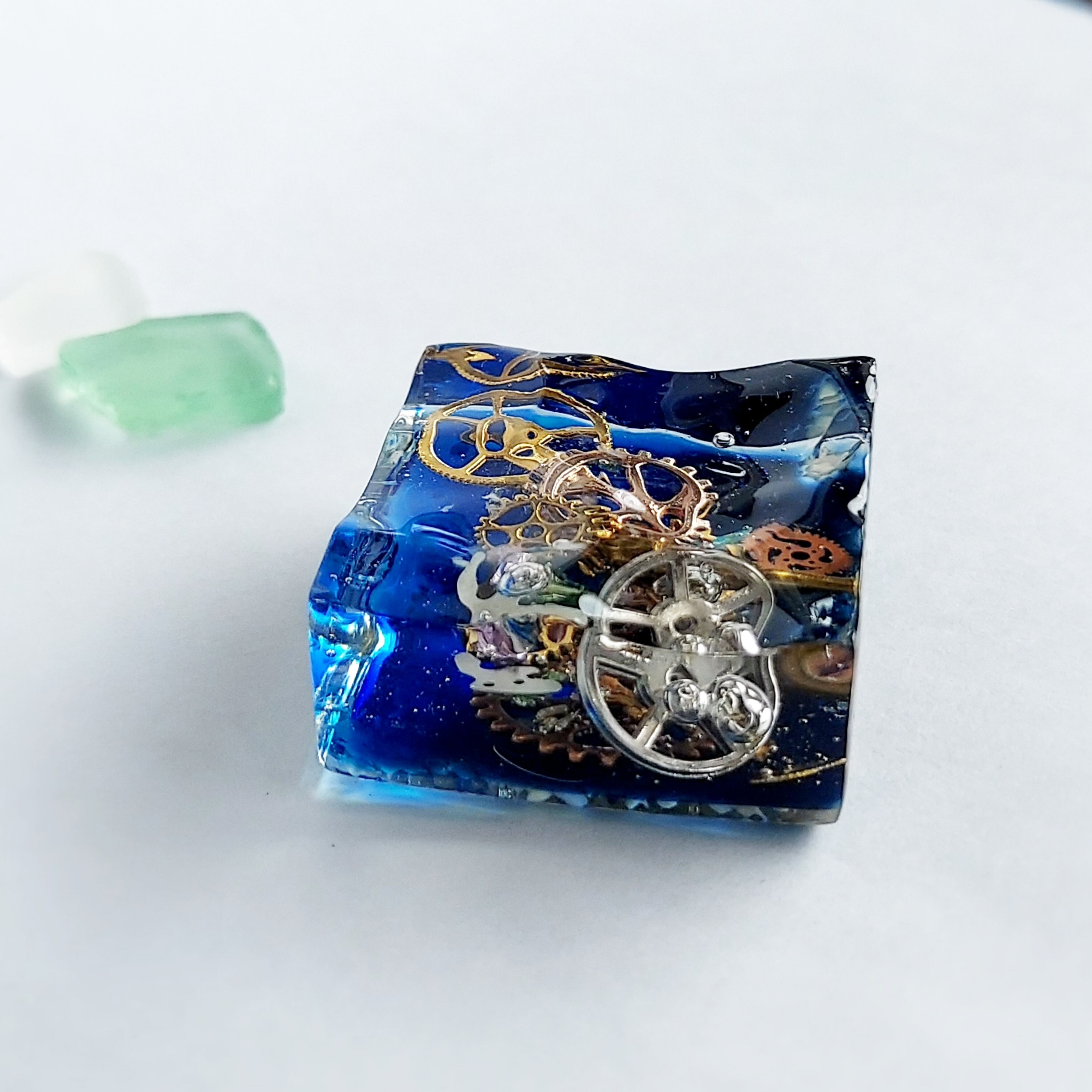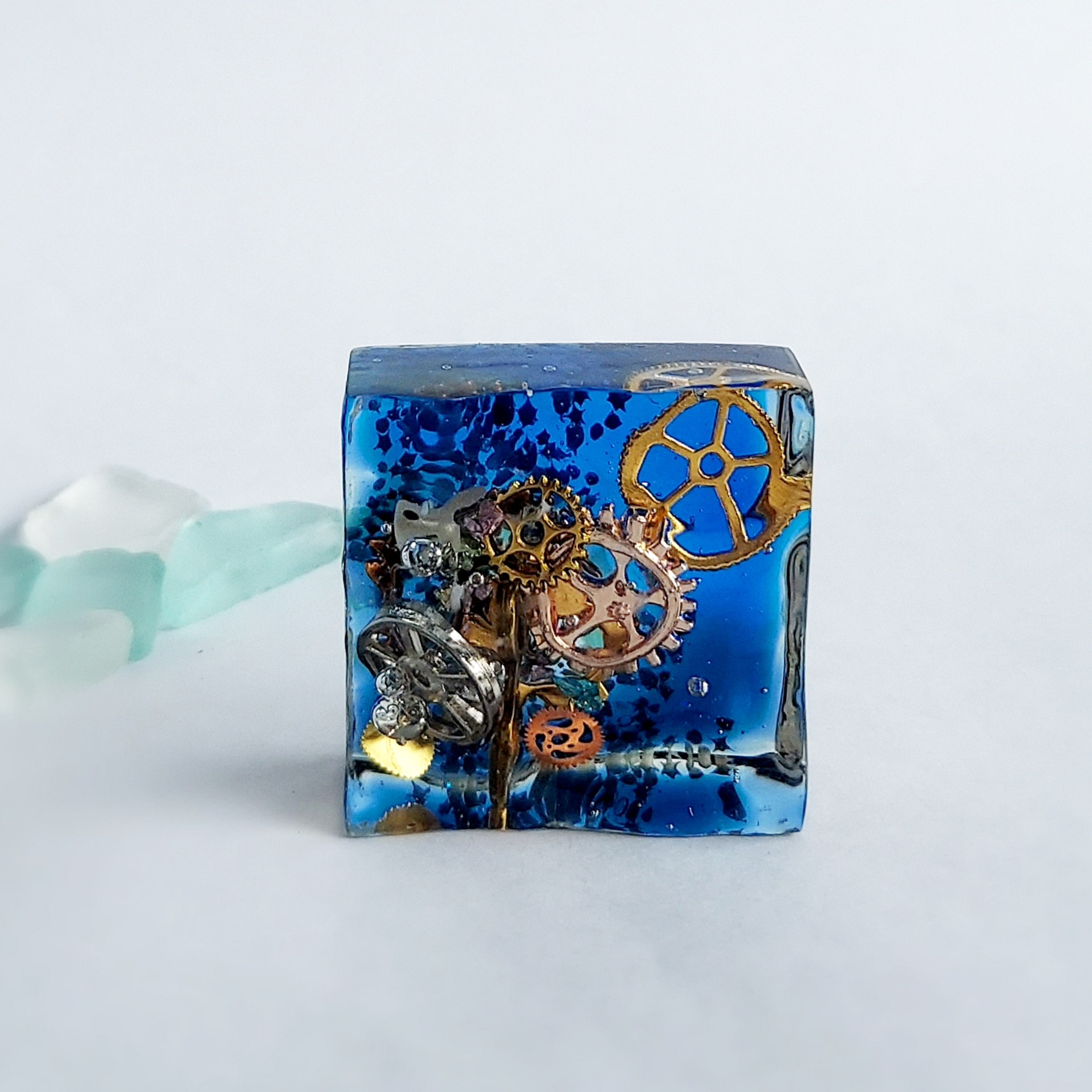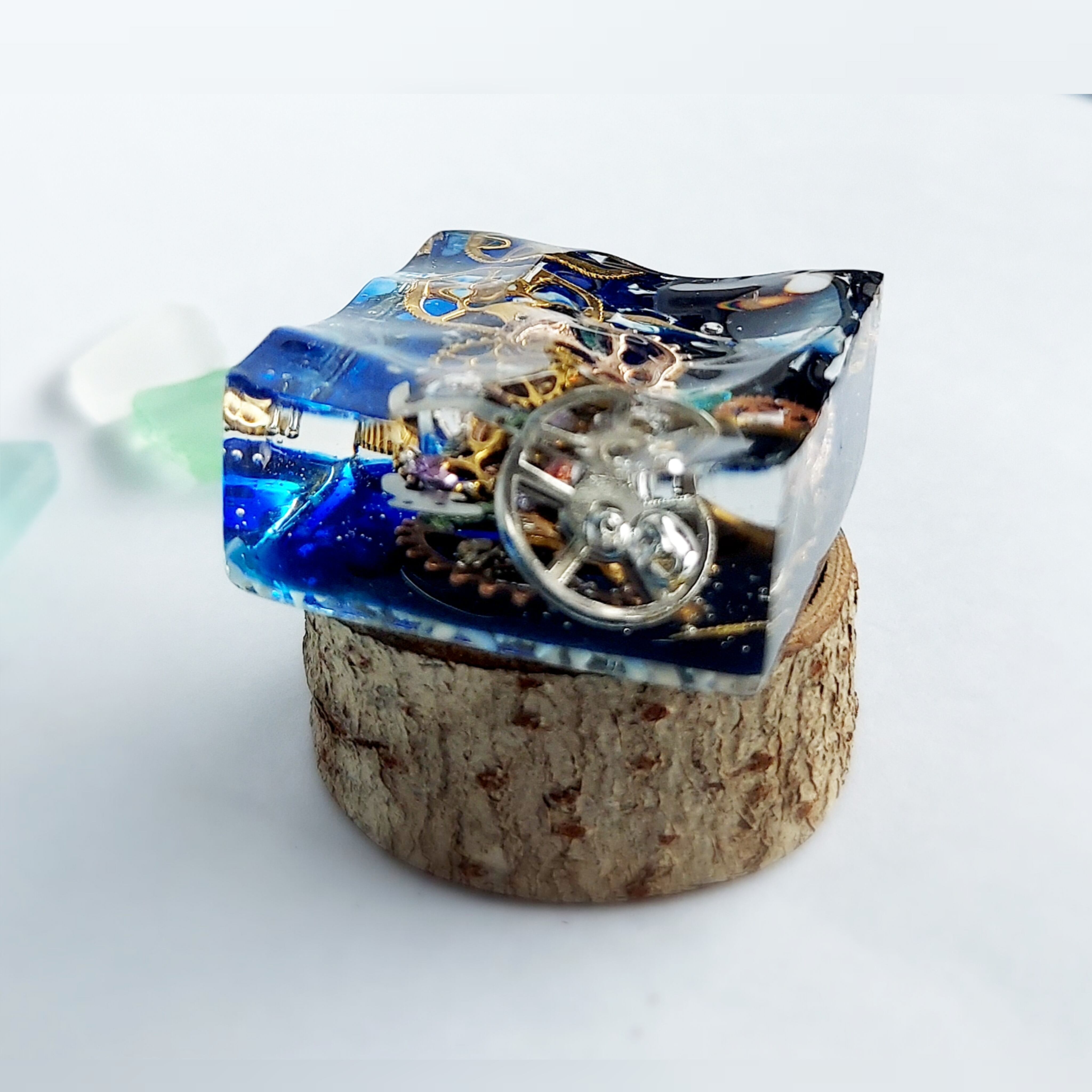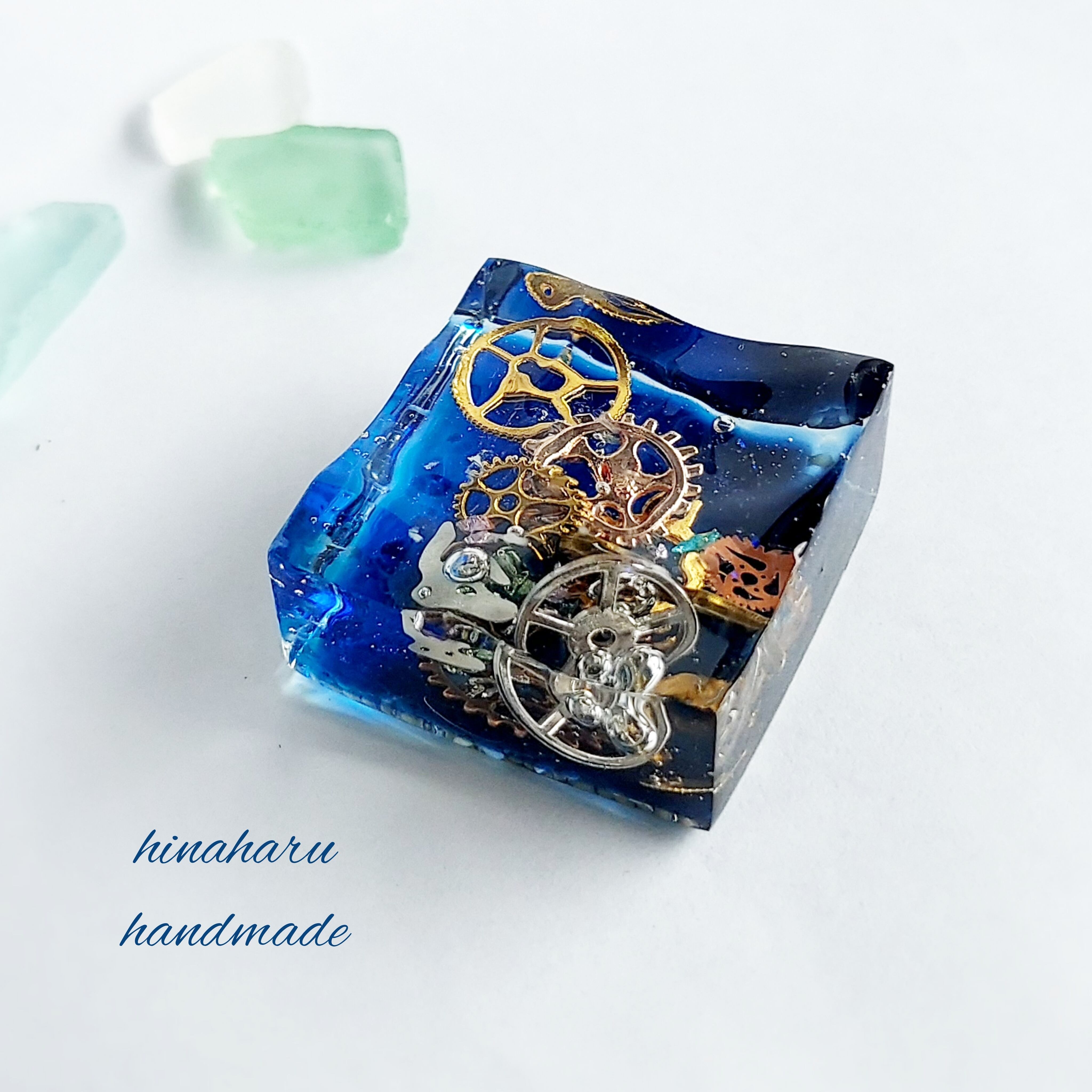 海の浜辺と歯車をとじ込めたレジンアートです。