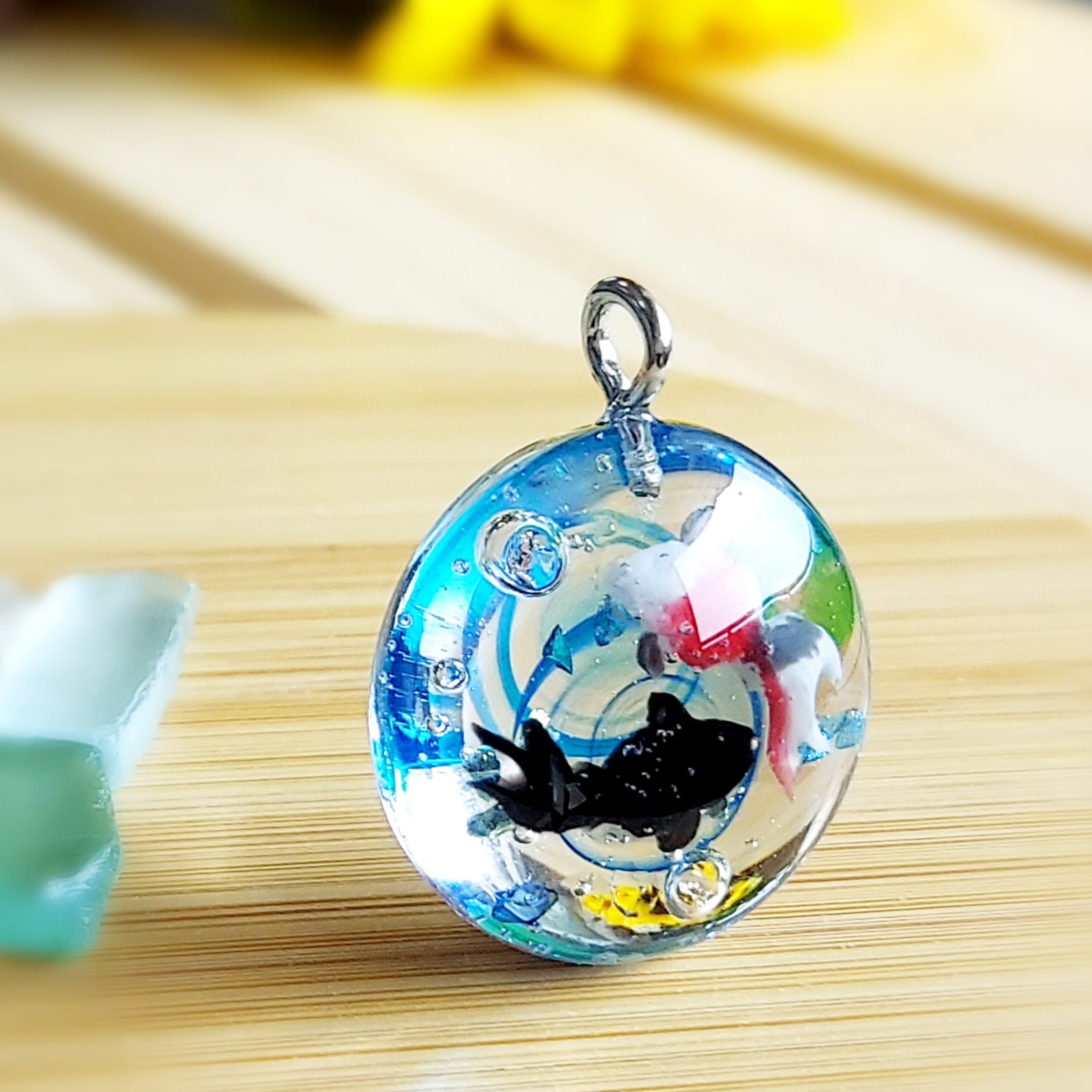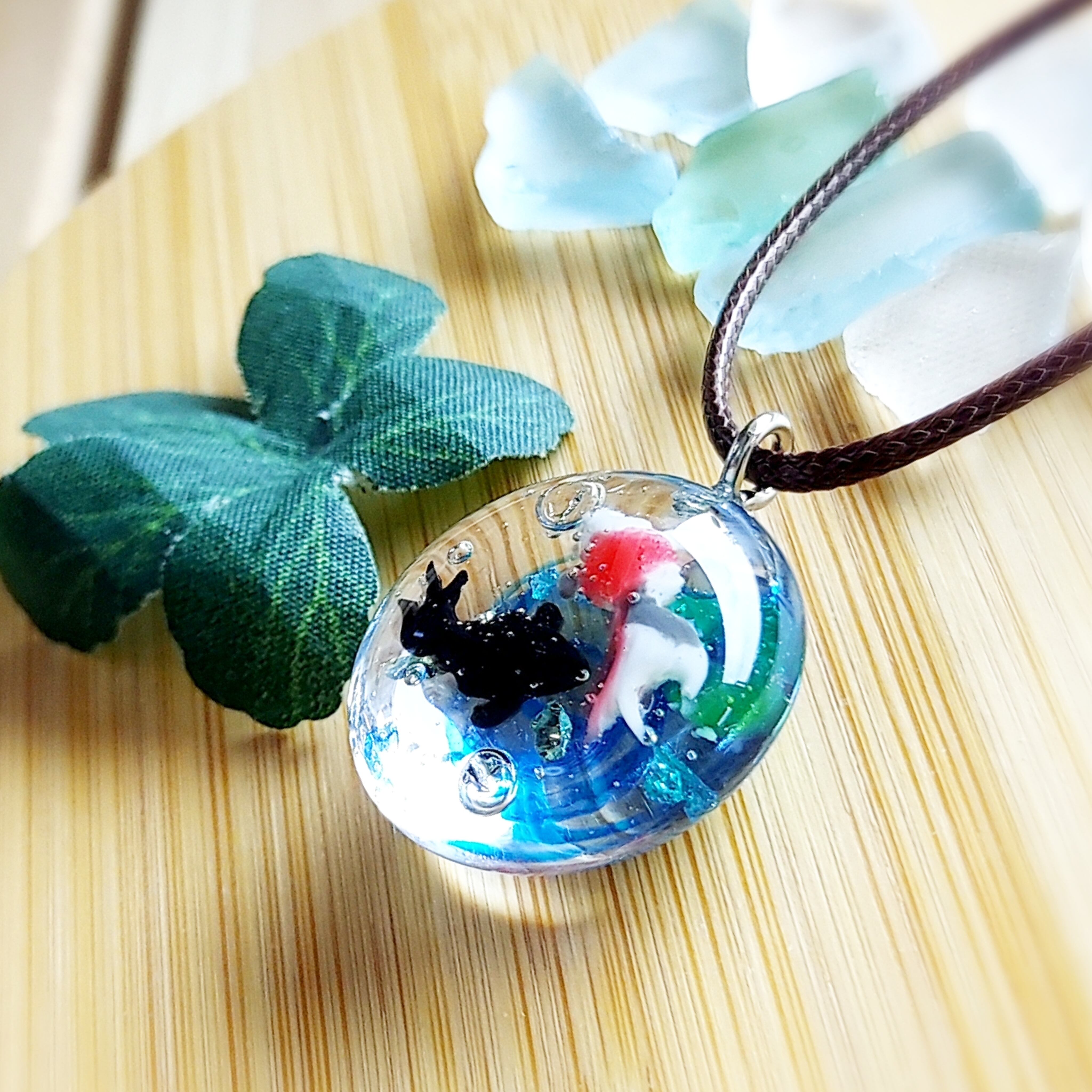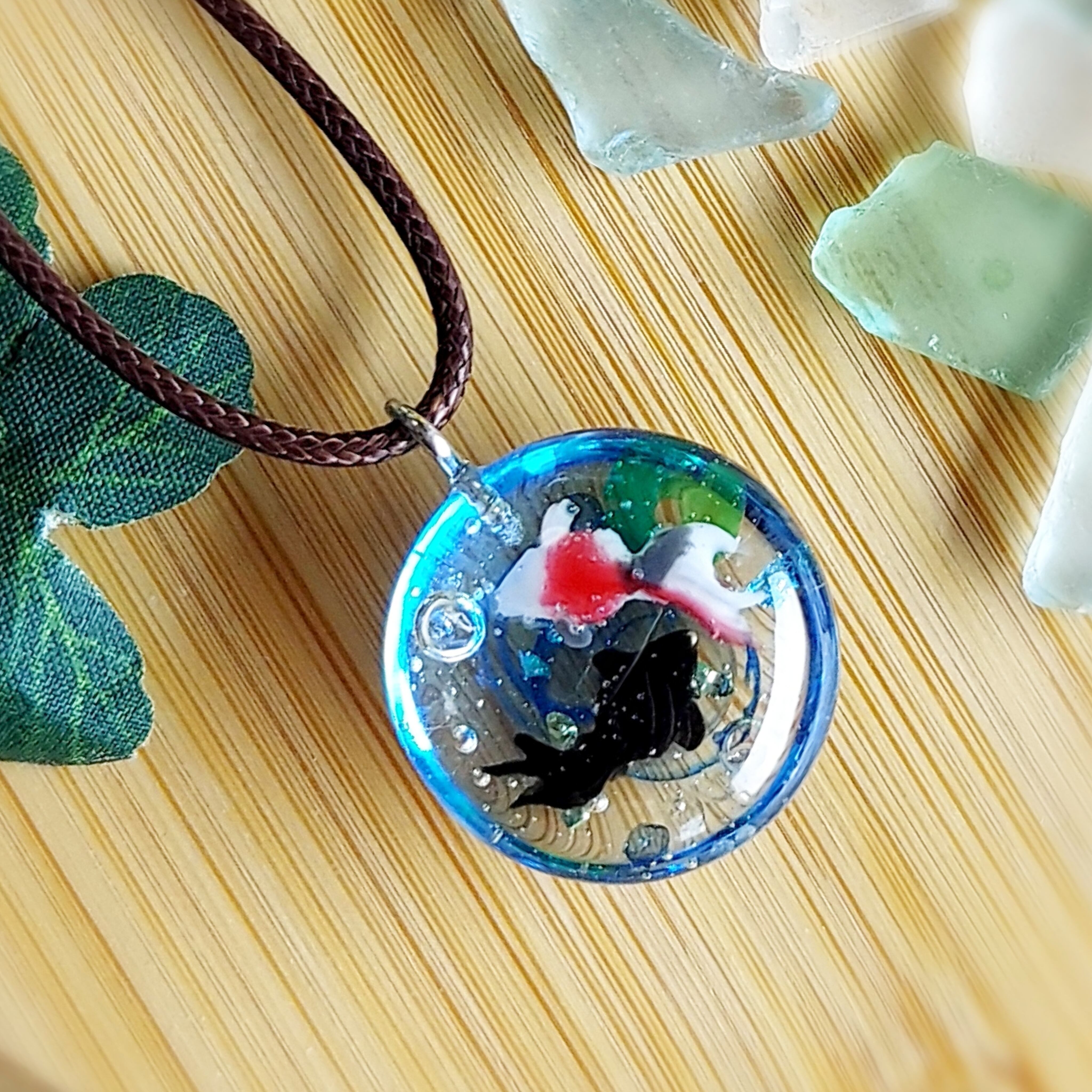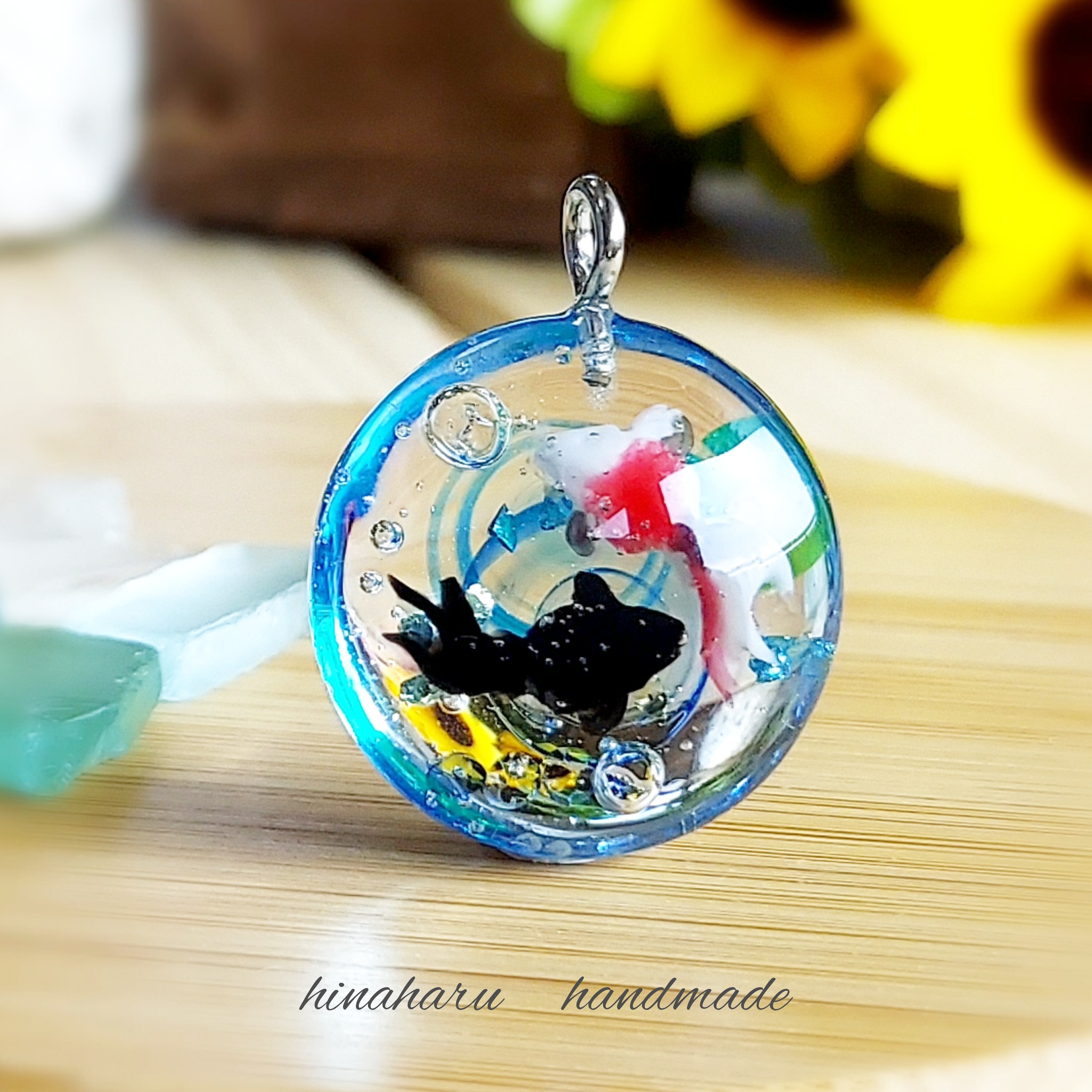 水の中を仲良く泳ぐ金魚を、レジンでぷっくりサークル型に閉じ込めたネックレスです。