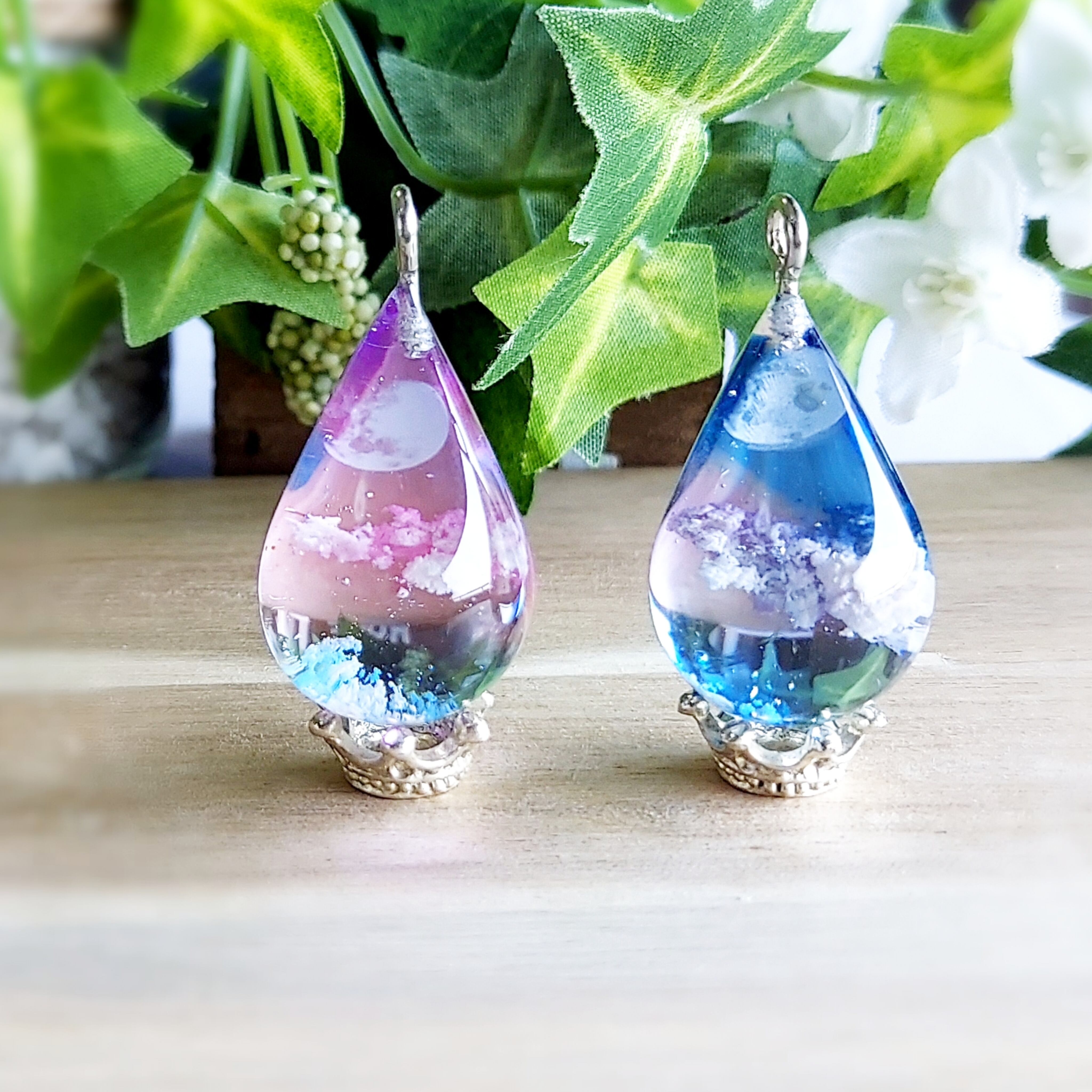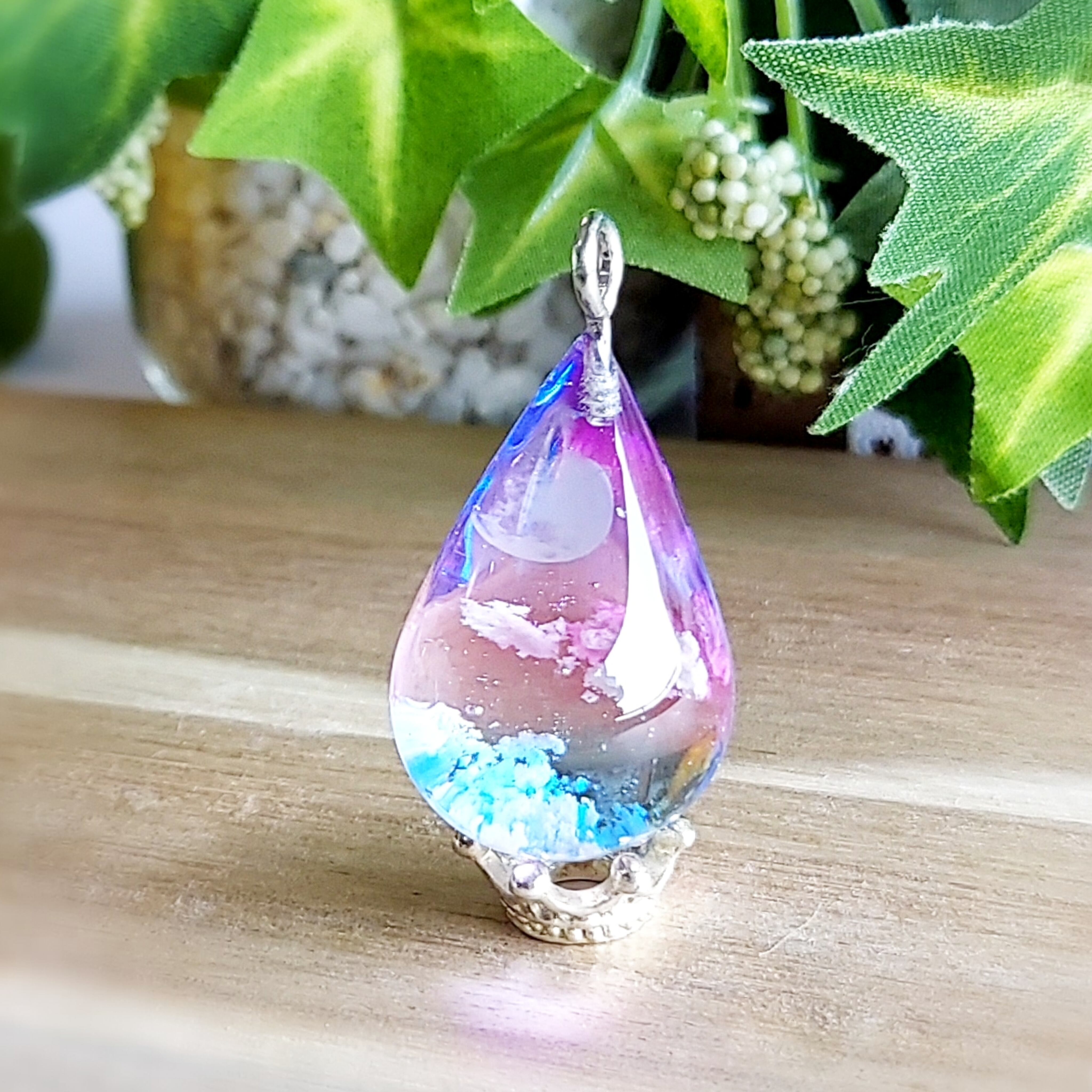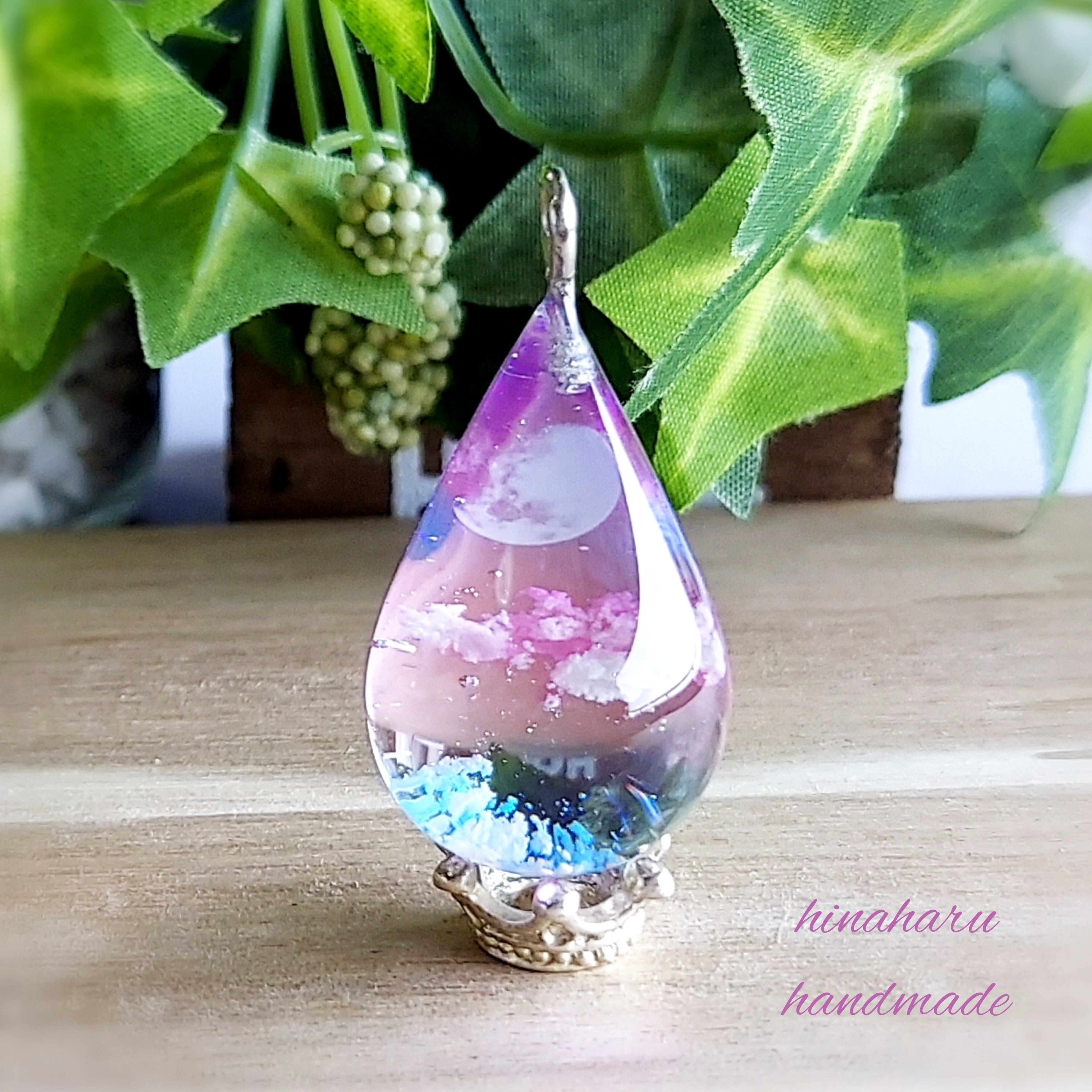 茜空と雲、月をドロップ型にとじ込めたネックレスです。