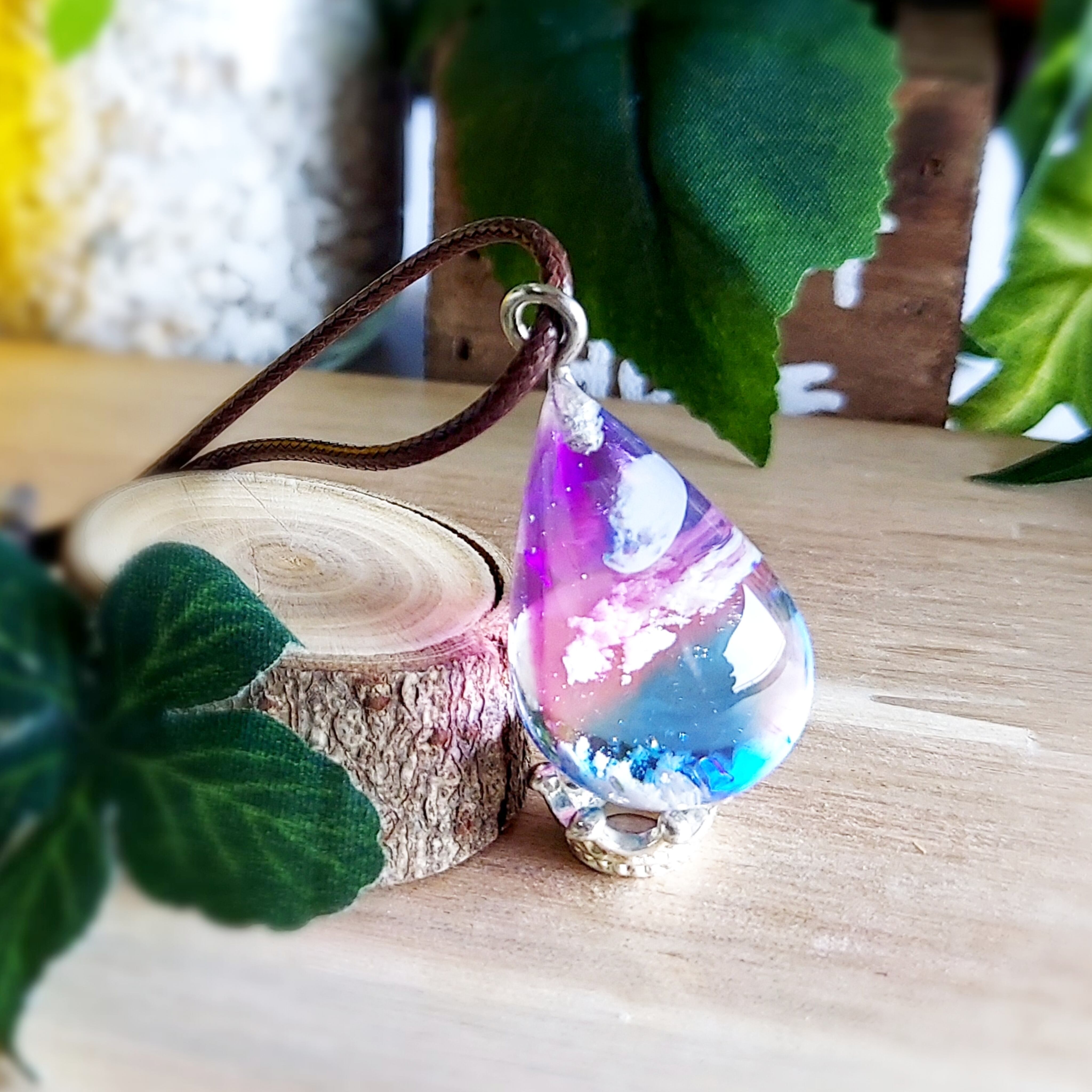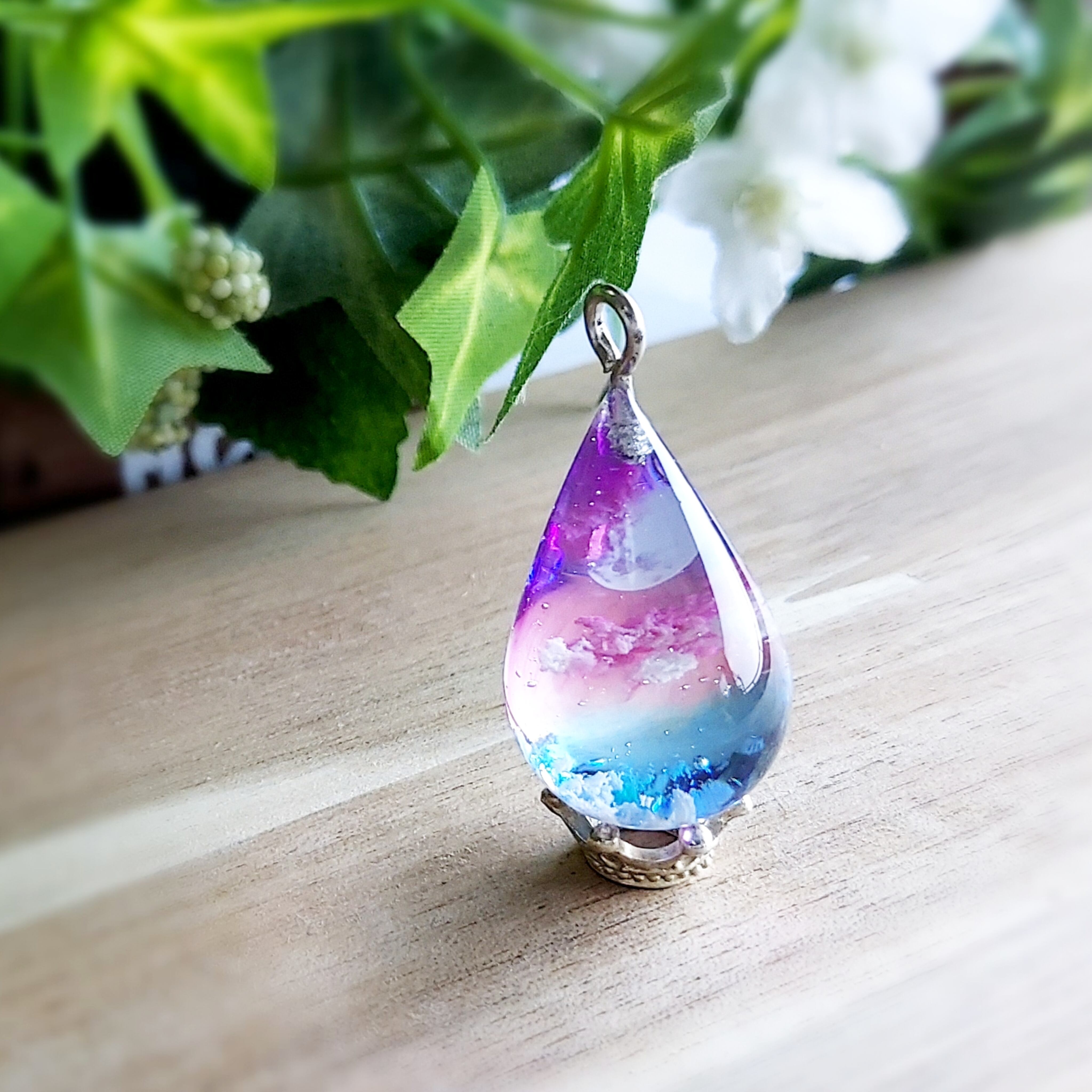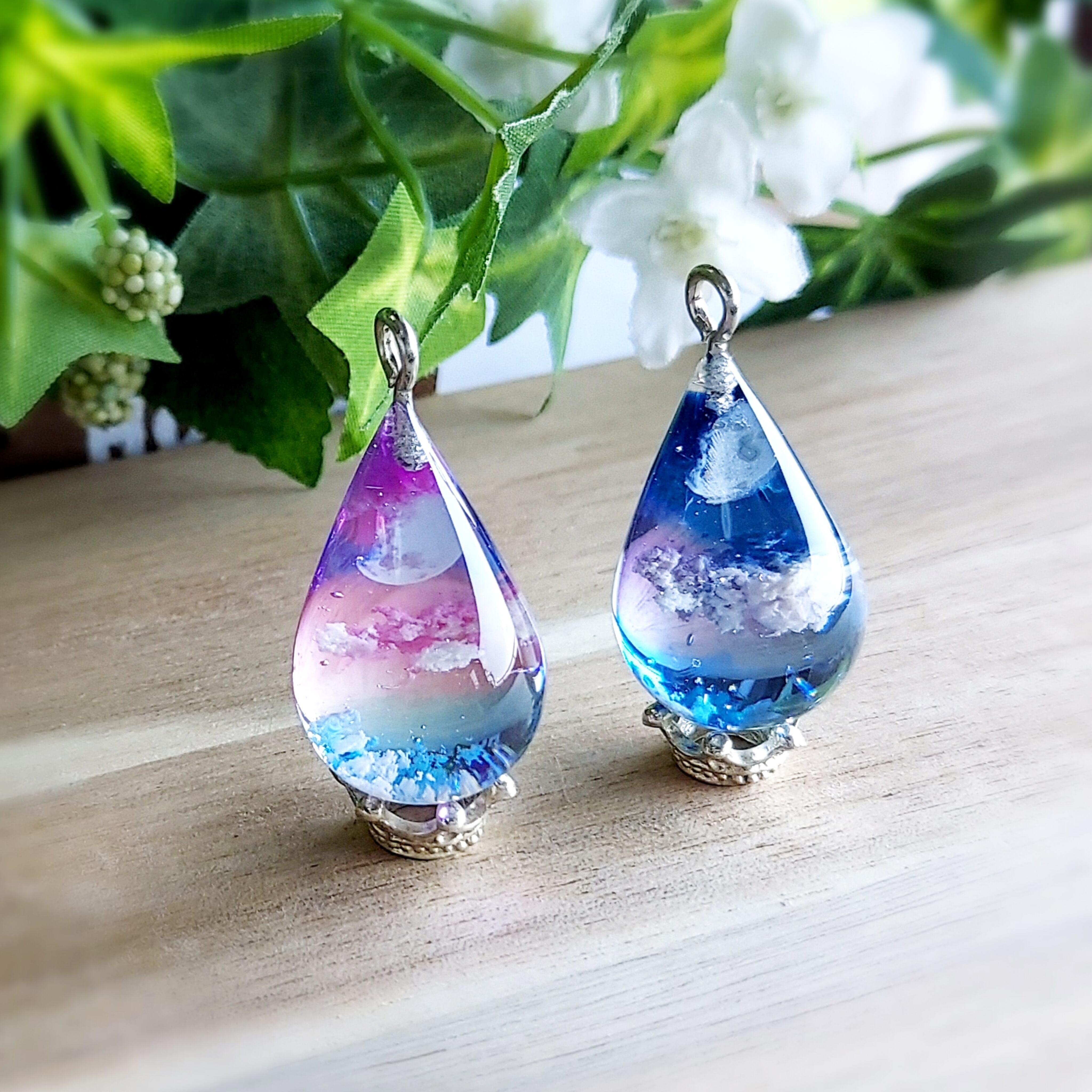 茜空と雲、月をドロップ型にとじ込めたネックレスです。